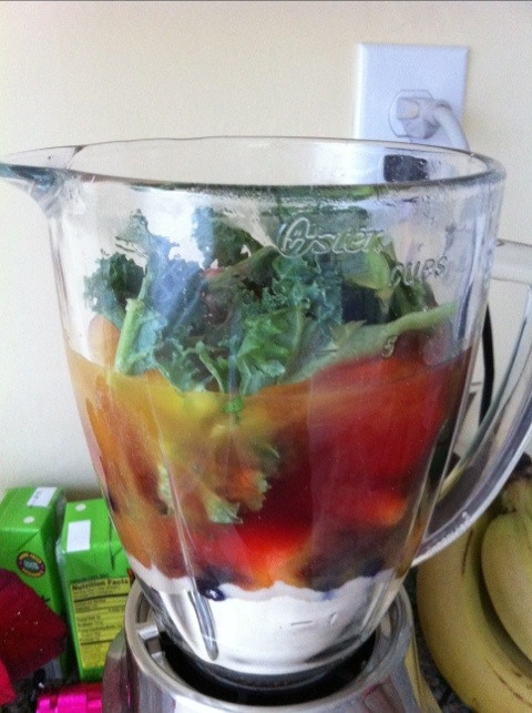 (The above is the recovery shake pre-blend. Blueberries, strawberries, Kale, spinach, juice, protein powder and Leslie’s favorite- flaxseed)