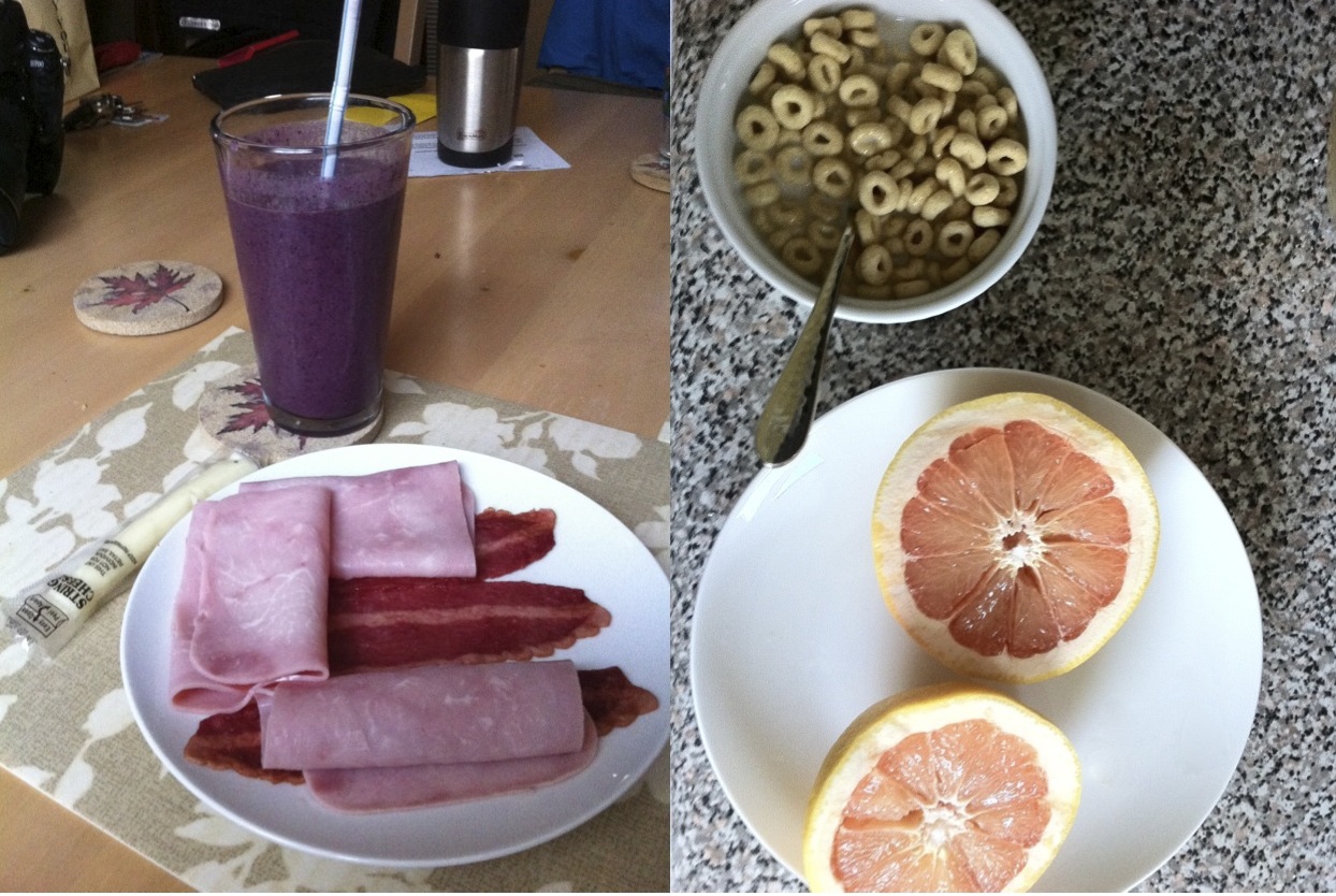 ( My breakfast on the left vs. Leslie’s breakfast on the right. )