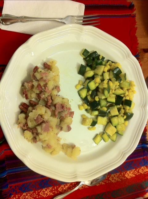 This is actually from one of my mom’s famous Sunday dinners – she made corned beef hash. The potatoes counted as two servings of carbs, the meat as two servings of protein and the veggies are corn and zucchini – a total of two servings. Esta es una de las cenas dominicales de mi mama – hizo una cecerola. La papa cuentan como 2 porciones de carbohidratos, la carne como 2 de proteina y los vegetales son zapallo y choclo – un total de 2 porciones