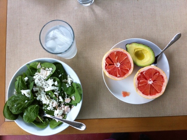 2 cups of spinach, 1 oz. of feta and diced baked chicken in the salad, the rest of the 6 oz. piece of chicken is also diced up to go with the avocado, and a grapefruit (this covers one serving of veggies, one of fruit, 2 of protein, one of dairy and one of fat) 2 tazas de espinaca, 1 onza de queso feta y pollo al horno cortado en pedacitos, el resto de las 6 onzas de pollo las corte para comerlas con la palta, y un pomelo ( esto cubre una porcio de vegetales, uan de fruta, 2 de proteina, 1 de lacteos y 1 de grasas)