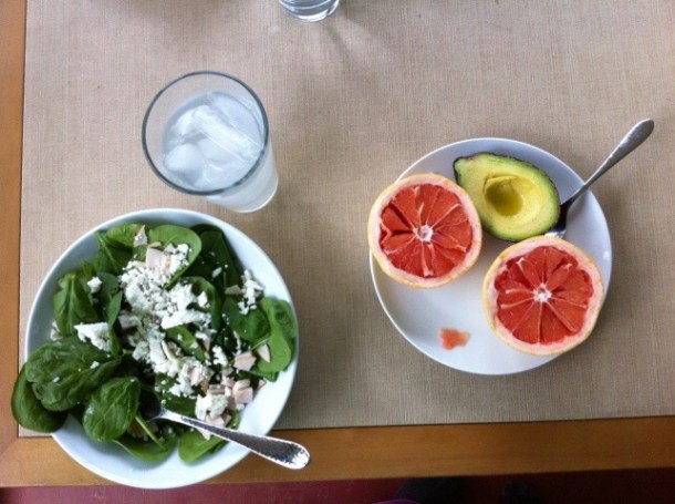 This is the salad I love and eat almost every day – diced turkey slices (3 oz for one serving of protein), 2 cups of spinach (one serving of veggies) and 1 oz. of feta cheese (one dairy serving), half an avocado that I ate out of the skin with olive oil in the middle and a grapefruit (1 medium-sized grapefruit is a serving of fruit). Esta es la ensalada que me encata y como casi todos los dias – jamos de pavo en pedacitos (3 onzas es 1 proteina), 2 tazas de espinaca (una porcion de vegetales) y una onza de queso feta (una porcion de lacteo), mitad de una palta que comi directo de la cascara con aceite de oliva y un pomelo ( un pemelo es una porcion de fruta)