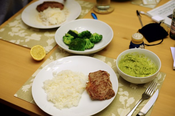 Steak night! One of the best nights of the week! Here we have 6oz. of steak (2 servings of protein), a serving of fat with the avocado, a cup of rice for the carb and a serving of broccoli for the veggie. Noche de carne roja! Una de las mejores noches de la semana! Aqui tenemos un trozo de 6 onzas (2 porciones de proteina), una porcion de grasa con la palta, 1 taza de arros para una porcion de carbohidratos y broccoli para el vegetal.
