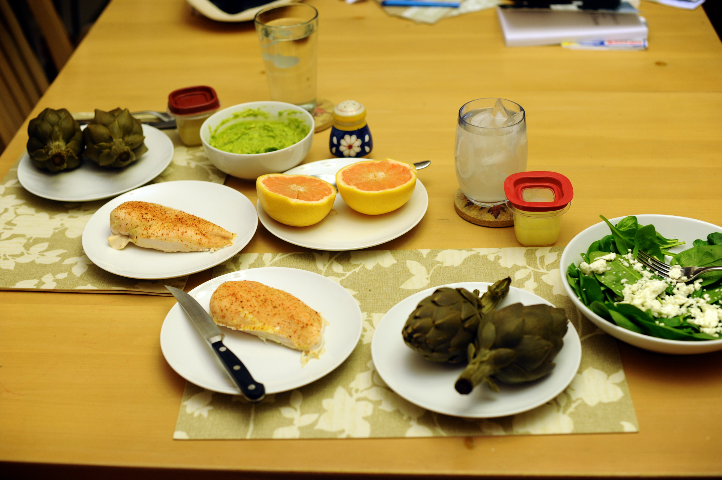 This dinner was actually too much for me – I didn’t touch the meat because I was so full after the artichokes and grapefruit and salad. Javi ate the whole thing. The artichokes + salad counted for two servings of veggies, the feta (1 oz.) as a serving of dairy, the grapefruit as a serving of fruit, Javi’s got his avocado over there for his daily serving of fat and then we each had about 8oz. worth of meat, or almost 3 servings of protein, in the chicken. Esta cena fue mucho para mi – no toque la carne porque estaba llena despues de las alcachofas, el pomelo y la ensalada. Javi se lo comio todo. Las alcachofas + la ensalada contaron como 2 porciones de vegetales, el queso feta (1 oz) es una porcion de lacteos, el pomelo una porcion de fruta, Javi comio su palta para su porcion de grasa y cada uno comio 8 onzas de carne, o casi 3 porciones de proteina en el pollo.