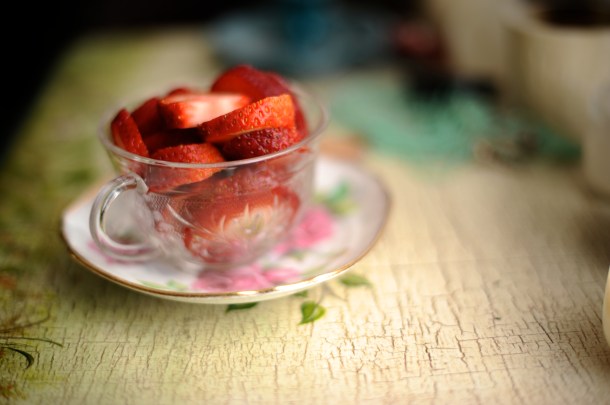 Sometimes I save my fruit for a midday snack – 2 cups of sliced strawberries counts as a fruit so I split it up into two 1-cup servings and spread it out over the day. This is one cup – a perfect snack! A veces guardo mi fruta para comerla como snak al medio dia – 2 tazas de frutilla cortada cuenta como 1 fruta asi que las dividi en dos porciones de 1 taza y las comi a lo largo del dia. Esta es una taza – un snack perfecto!