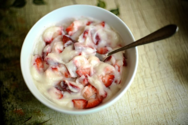 And for all you dessert types (like me), try putting the other cup of sliced strawberries with some kind of low fat plain or vanilla yogurt. Go for low fat and low sugar in the yogurt nutrition facts. I’m still obsessed with the coconut milk greek yogurt at Whole Foods – this is the vanilla flavor. Y para quienes les gustan los postres (como yo), intenten poner la otra taza de frutillas en un yoghurt bajo en grasas sin sabor o de vainilla. Usen bajo en grasa y bajo en azucar. Todavia estoy loca por el yoghurt estilo griego de coco que venden en Whole Foods – este es el de sabor vainilla.