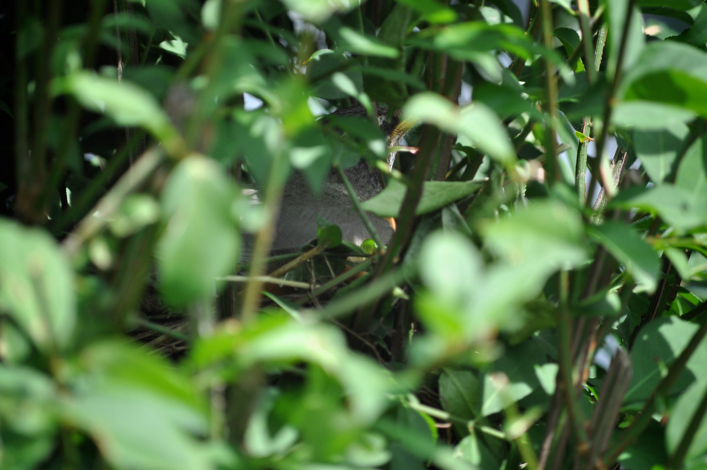 | While we were working around the shrubs outside our kitchen window, a protective little robin aggressively let us know that plants are not the only growing things in the yard. Actually the little bird didn’t scare either Leslie or me, she (or… we think is a momma) scared the crap out of a contractor. We just heard the scream and saw the bird flying out like a bullet…when we went to check out the area, we found out this little surprise: | Mientras trabajabamos en los matorrales afuera de la ventana de la cocina, un zorzal muy portector de lo suyo nos dijo de manera muy agresiva que las plantas no eran lo unico que crecia en el patio. La verdad es que el pajaro no asusto ni a Leslie ni a mi, ella (o…pensamos que es la mama pajaro) asusto a cagarse al jardinero. Nosotros solo escuchamos el grito y vimos al pajaro salir como bala…cuando fuimos a revisar el area, nos encotnramos con esta sorpresa: |