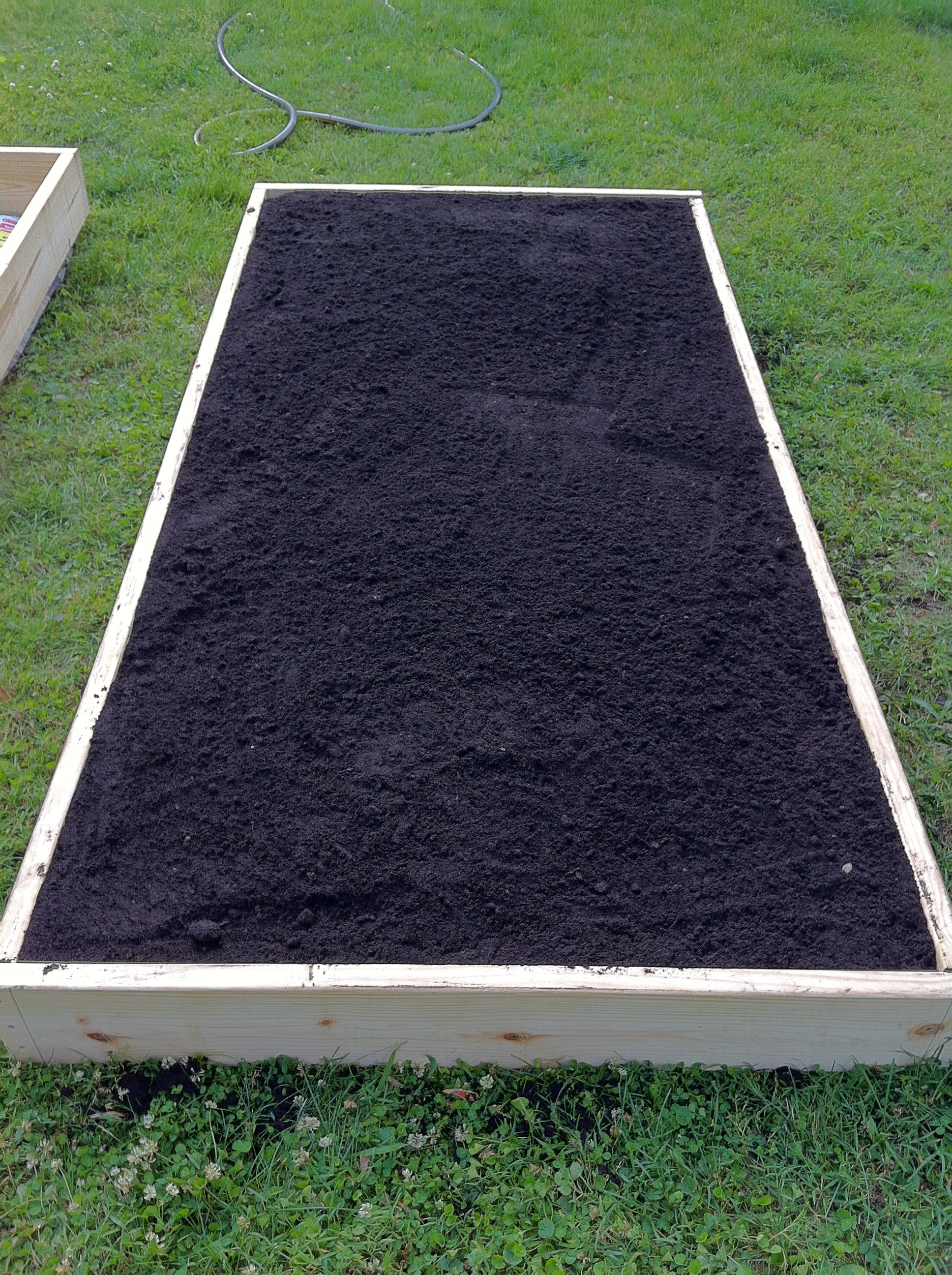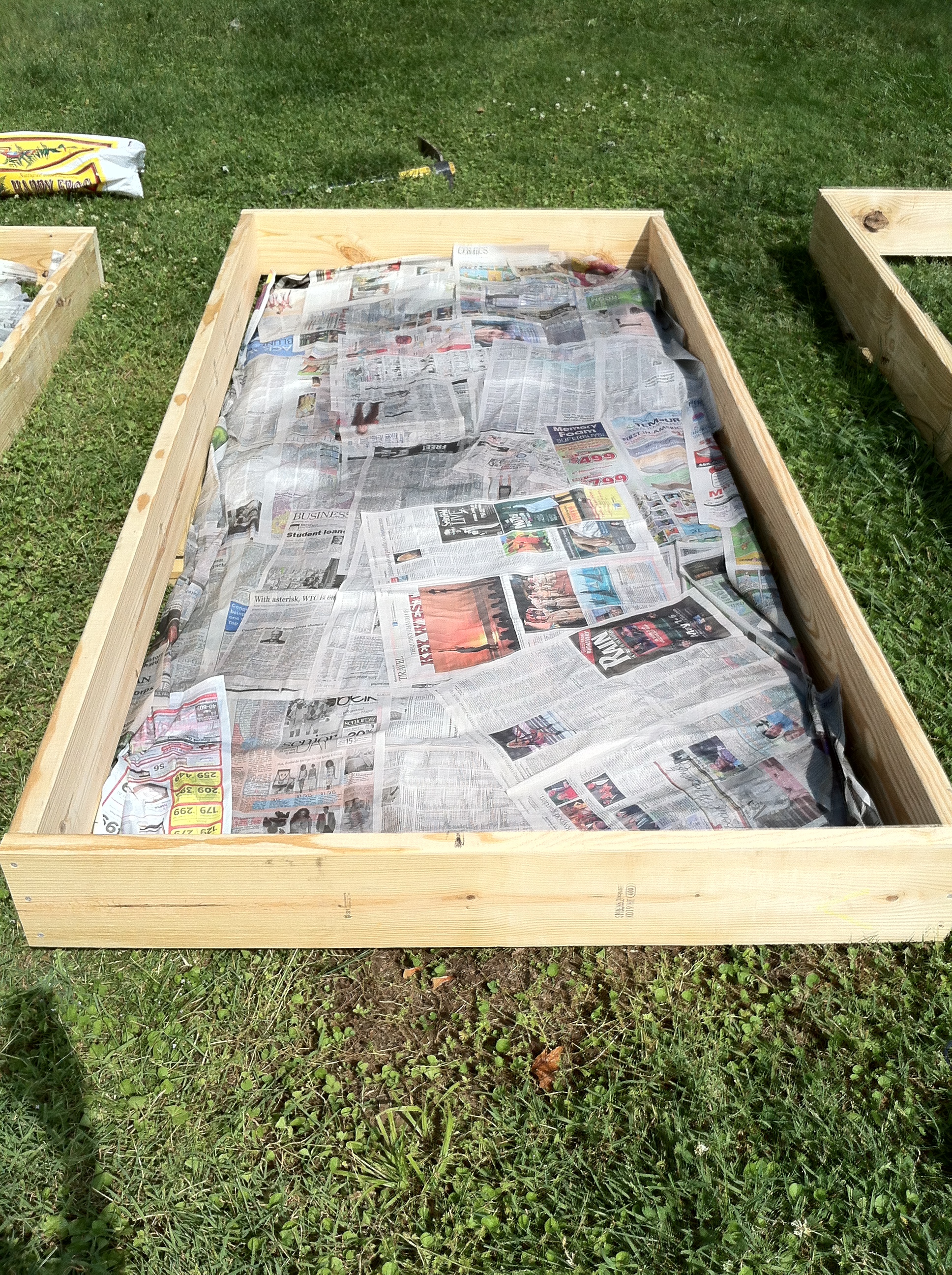 | I made 3 raised beds using (9) 2 x 8 x 8 lumber (pine). The beds are 4 x 8, giving us plenty of space to grow a ton of food. I know pine will rot eventually and is not bug resistant but I wanted to save some money. If I see the wood getting really bad I can easily replace the piece…I am sure it will last at least a couple of years! If you want to use the best wood for the job and spend a little more money, I recommend cedar. Anyway, I placed the beds on top of the grass in the spot in our yard that gets the most sunlight throughout the day. It’s also fairly level which helps with drainage. Once I placed the beds I put a layer of newspaper to cover the grass to speed up the decomposition process. The newspaper is biodegradable and will disintegrate with time so it wont harm the root growth. | Hize 3 camas usando pino de 2 x 8 x 8. Las camas son de 4 x 8 pies y se levantan 8 pulgadas, lo que nos da mucho espacio para cultivar un monton de comida. Se que el pino se va a podrir en algun minuto y que no es resistente a los bichos pero queria ahorrarme algo de plata. Si veo que la madera se esta poniendo muy mala puedo reemplazar la pieza…estoy seguro que durara unos cuantos anos! Si quieres usar una mejor madera y no te importa gastar mas, el cedro es lo mejor Pero bueno, puse las camas encima del pasto en el lugar del patio donde les llega la maxima cantidad de sol durante el dia. Tambien es mas o menos nivelado, lo que ayuda al drenage. Una vez que instale las camas, puse una capa de papel de diario para cubrir el pasto y apurar el proceso de descomposicion. El papel de diario es biodegradable y se desintegrara con el tiempo asi que no afectara el crecimiento de las raices. |