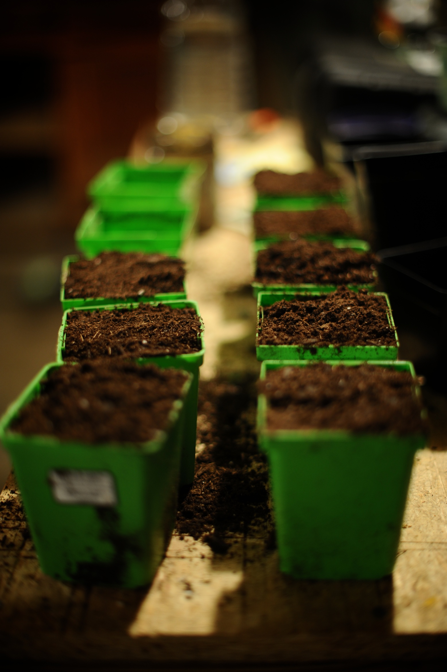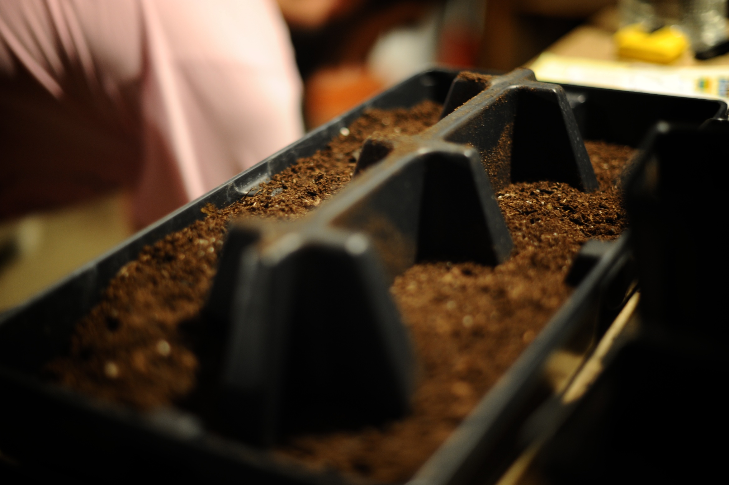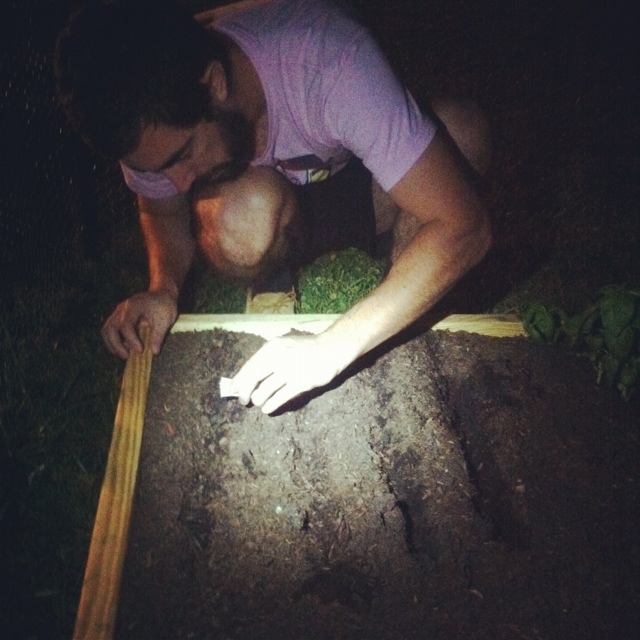 | We planted the sunflowers and the corn in individual pots, and once they grow big enough we will transplant them to their final spot in the yard. For the radishes we used a tray. We just reused the pots and trays that the other plants came in from Gardens of Babylon – nice and cheap! They don’t need to be deep in the soil so hopefully this tray will be the right amount of soil for them. If not, we can try to plant them in one of the beds. We put the green onion seeds directly in one of our raised beds (and for some reason it just couldn’t wait til morning…). We had a good spot for them where nothing was growing at the time, so we will see if they like that spot. | Plantamos los girasoles y el choclo en maceteros individuales, y una vez que crezcan lo suficiente las pondremos en su lugar final en nuestro jardin. Para los rabanos usamos una bandeja. Reusamos las macetas plasticas donde venian las otras plantas que compramos en Gardens of Babylon – barato y ordenado! Los rabanos no necesitan tierra profunda asi que ojala esta bandeja tendra suficiente tierra para ellos. Si no lo es, podemos tartar de plantarlos en una de las camas vegetales que temnemos. Pusimos los cebollines en la cama de vegetales ( y por alguna razon no podiamos esperar hasta la manana siguiente…). Teniamos un pedazo libre de plantas perfecto para plantar las semillas, asi que veremos si les gusta ese lugar. |