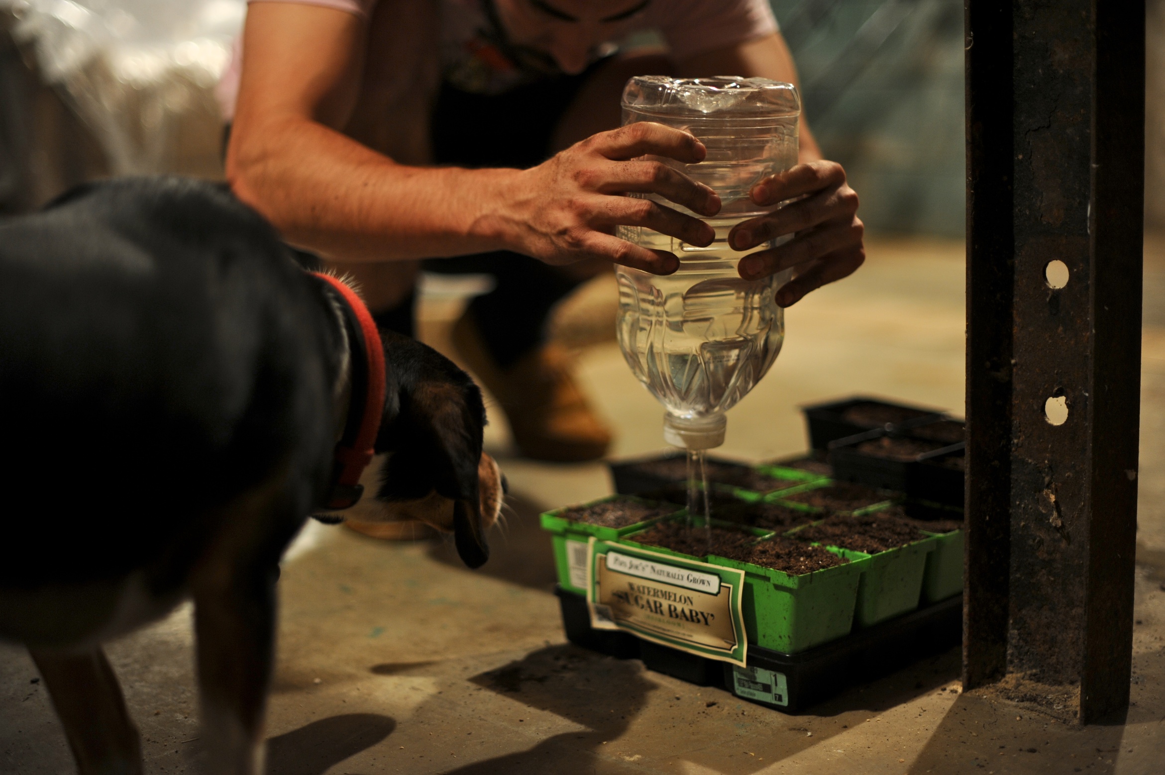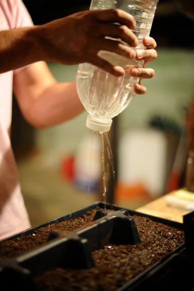 | To water the seeds I poked holes in a plastic bottle so it is easier to control the water flow and it allows me to water just the right amount for each little pot. This was fun to do, even the dogs were there for moral support and to make sure things were being done the right way…they know their stuff! Now we just have to wait and hope that we see some little plants popping out of those pots! | Para regarlas semillas, hize hoyos en la tapa de una botella plastica asi seria mas facil controlas el flujo de agua y me permitiria poner la justa cantidad de agua necesaria en casa macetero. Esto fue entretenido de hacer, incluso los perros participaron con su apoyo moral y asegurandose que haciamos las cosas de la menera correcta…ellos saben mucho sobre jardinaeria! Ahora tenemos que esperar que las plantitas empiezen a brotar en los maceteros! |