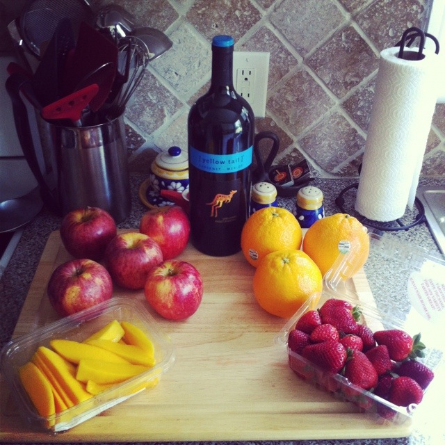 | The first thing I did was slice and dice all the fruit and put it in a big bowl with the schnapps and half the bottle of sweet red wine. I put the bowl in the freezer and let it sit for about 6 hours. When it was party time, I took the soaking, cold fruit in the bowl to the party and once I was there I ladled the fruit (with as little of the sweet red wine as possible) into the punch bowl. I poured as much of the cabernet merlot on top as the punch bowl could fit, mixed in about 2 cups of the fruit juice, and that was that! I didn’t add any other liquors – again, this drink was supposed to kick the night off, not end it. It was delicious and a great party drink – or at least I thought so! | Lo primero que hice fue cortar y picar la fruta y ponerlas en un bowl grande con las schnapps y mitad de la botella de vino tinto dulce. Puse el bowl en el freezer y lo deje ahi por mas o menos 6 horas. Al momento de la fiesta, lleve el bowl a la fiesta y una vez alli saque solo la fruta del bowl y la puse en el recipiente para el ponche. Puse todo el cabernet merlot, agregue mas o menos 2 tazas de jugo de fruta, y listo! No agregue ningun otro licor – de nuevo, el trago era para empezar la noche y no terminarla. Quedo delicioso y es un gran trago de fiesta – o por lo menos eso creo yo! |