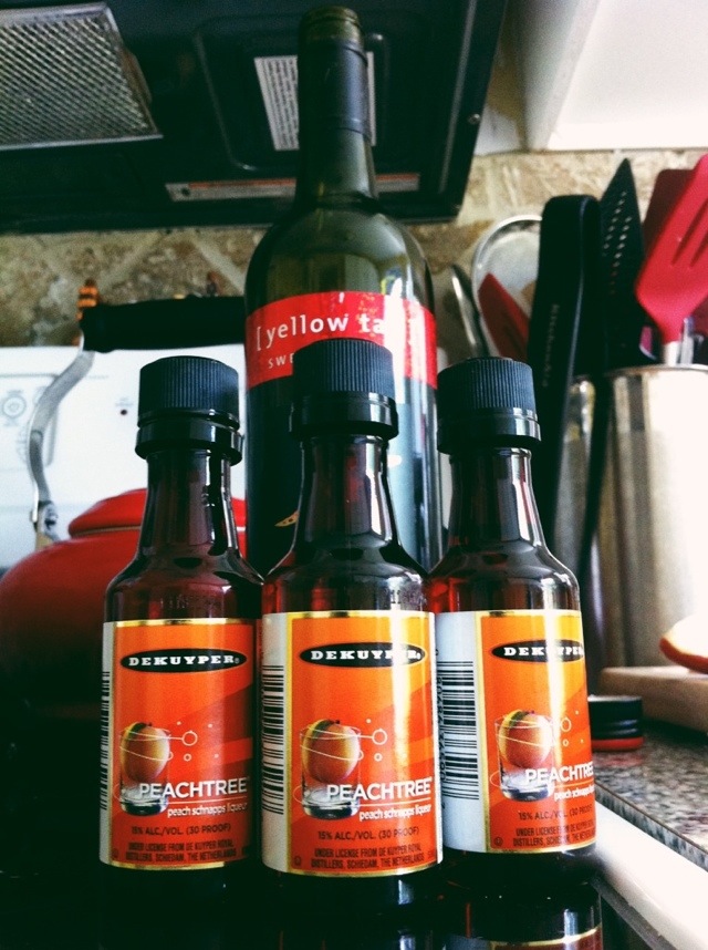 Two weeks ago the weekend started off with my good friend Ellen’s bachelorette party. For the party prep, I picked up a huge order of rice, beans, meat and tortillas from La Hacienda, one of our favorite Mexican restaurants in town. We decided that the best choice for drink to go with the food would be sangria instead of margaritas – it seemed weird to serve margaritas in a punch bowl and tequila is probably not the safest choice for a drink that’s supposed to start off the night. Maybe it’s good for ending the night…but sangria seemed like a safe bet to kick it off. SO, before the party I made up a gigantic batch of sangria filled with peach schnapps-infused fruit. I didn’t have a recipe when I went out to the store to buy ingredients and I tried to google one but the “easy” recipes were all actually quite complicated – so I decided to wing it. The final ingredients were: