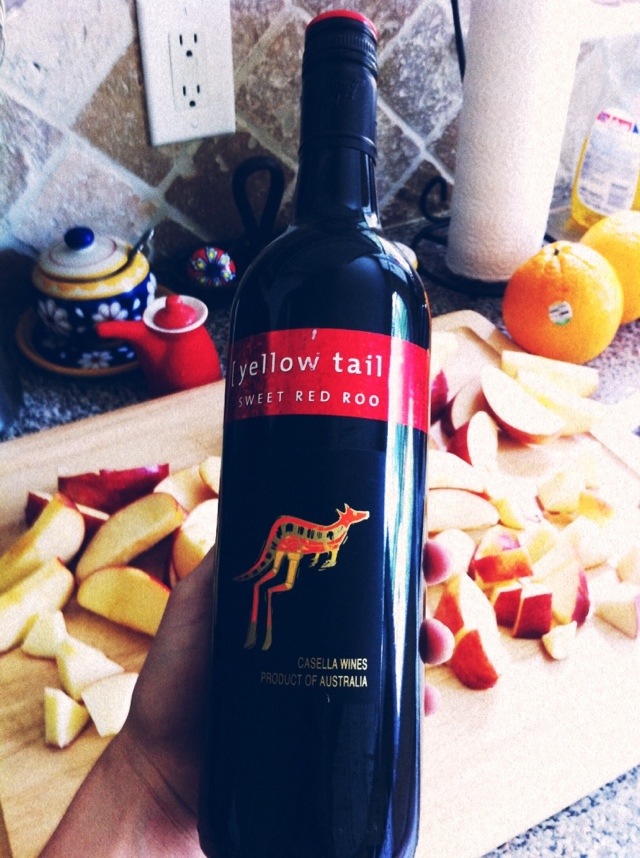Dos semanas atras, el fin de semana comenzo con la despedida de soltera de mi buena amiga Ellen. Para preparar la fiesta, ordene una porcion gigante de arros, porotos, carne, y tortillas en uno de nuestros restaurants Mexicanos favoritos – La Hacienda. Decidimos que la mejor opcion de trago para acompanar la comida seria sangria en vez de margarita – me parecia raro servir margaritas en un bowl de ponche y tequila no es la opcion mas segura para empezar la noche. Tal vez es bueno para el final de la noche….pero sangria nos parecio una opcion segura. Asi que…antes de la fiesta, hize un monton de sangria a la que le agrege fruta. No tenia una receta cuando fui a la tienda a comprar ingredientesy cuando busque en google recetas simples… las que encontre eran bastante complicadas – asi que decidi jugarmela por mi propia receta y al ojo. Los ingredients finales fueron: