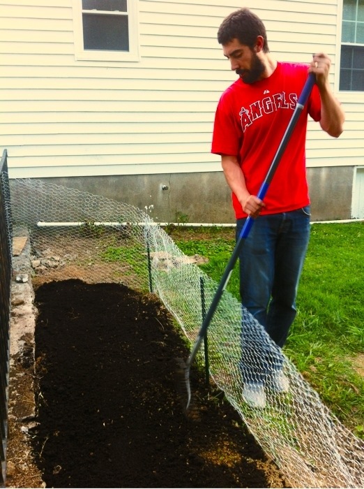 For the sunflowers, we prepared a little bed by the side fence that lines the walkway down to the basement. This spot gets sun all day long and it needs some floral adornment – a line of shrubs used to cover this spot and we NEVER took care of them and they wound up looking like an overgrown jungle (see the picture below). We cut them down last year before the first frost and they didn’t grow back until this spring, so Javi finally went in and dug the roots out so we could use the spot for a flower bed. We didn’t dig holes in the ground for these, we just put the chicken wire around the spot, spread some soil and placed the sunflowers in the ground, putting plenty of extra soil around them to cover the roots. All of them are doing really well except one, which apparently couldn’t handle the transplant shock. In addition to planting the 5 sunflowers we already started, we also planted about 20 more sunflower seeds in two staggered rows in front of the seedlings, so hopefully we’ll have a bunch of sunflowers by the end of the summer! Para los girasoles, hicimos un lugar especial al lado de la reja que alinea la entrada hacia nuestro subterraneo. Este lugar tiene luz del sol la mayor parte del dia y necesita algun tipo de arreglo floral – una lines de matorrales solia estar ahi pero nunca los cuidamos y terminaron viendose como una jungla. Los podamos el ano pasado antes de la primera escarcha y no crecieron hasta la primavera, asi que Javi finalmente se aburrio y desenterro las raices, protegimos el lugar con malla de alambre, pusimos tierra de hoja, transplantamos los girasoles, y pusimos mas tierrade hoja para cubrir las raices. Todas las plantitas estan bien excepto por una, la cual al parecer no pudo soportar el shock. Ademas de las 5 plantitas que transplantamos, plantamos 20 girasoles mas en 2 lineas que ojala creceran y nos daran un monton de girasoles al final del verano!