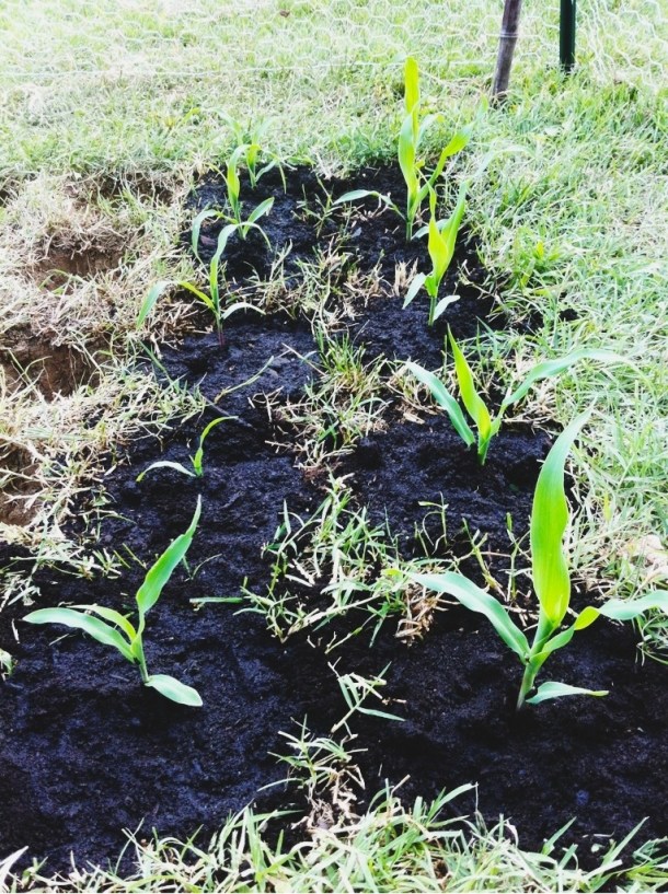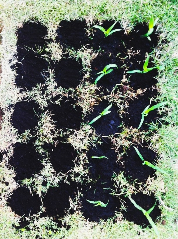 Anyway, this past week we (Javi) noticed that the little seedlings were getting too big for their pots and it was time to do the big transplant. Javi dug 20 little holes in the ground for the corn – they are like little in-ground pots about 10 inches from each other. He tells me that corn has to grow close to each other so they can cross-pollinate, so now we have a little corn patch as a 4th bed in the backyard garden. We carefully removed the seedlings from their pots and placed them in the in-ground pots, then covered them with new soil and watered them well so they’d be firmly set in the ground. Apparently they are adjusting well – they all grew about 2 inches in the 2 days since we did the transplant! Pretty amazing! Pero bueno, esta semanas nos dimos cuenta (Javi) que las semillas brotaron y estaban creciendo demasiado para sus maceteros y era hora de transplantar. Javi hizo 20 hoyos en el pasto para el choclo – son como tener meceteros en la tierra con 10 pulgadas de separacion. El me dice que el choclo necesita crecer mas o menos cerca para polinizar, asi que ahora tenemos una mini plantacion de choclo en el jardin. Con mucho cuidados sacamos las plantitas de sus maceteros y las pusimos en los hoyos en la tierra, las cubrimos con tierra de hoja y las regamos para que se afirmaran a la tierra. Aparentemente se estan acostumbrando a su nuevo lugar – todas han crecido mas o menos 2 pulgadas en un par de dias despues del transplante! Muy genial!