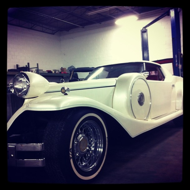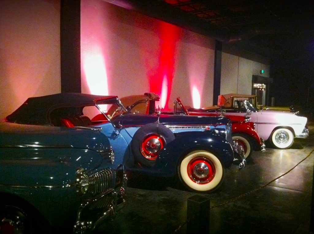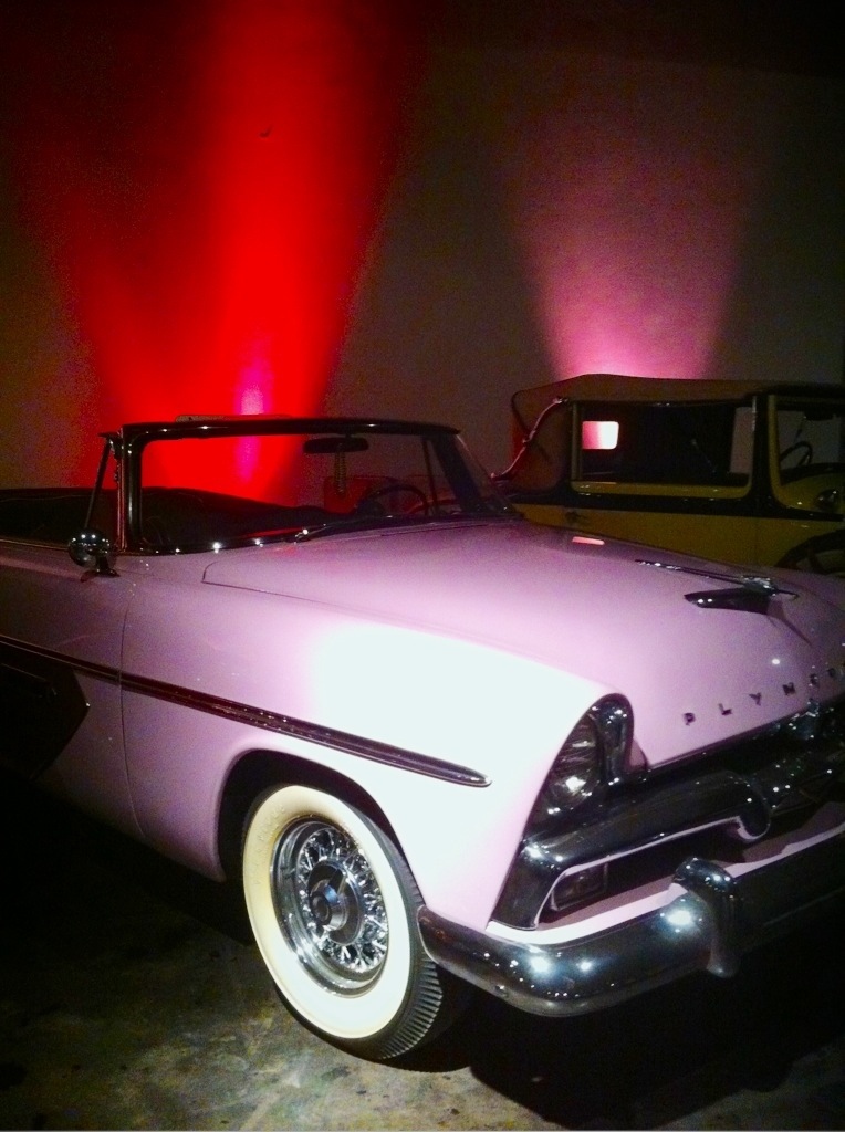 After the ceremony we went to the reception, which was held at a place called “Old Car Heaven.” It was appropriately named – there were beautiful restored old cars everywhere. When we walked into the main room (which was huge) there were old cars lining the wall and behind the stage there was a whole garage  full of old cars from every era of American car history. It was like a car museum, and we walked through taking pictures of our favorite cars – or pining over them (which is what Javi did with this pretty red truck). Despues de la ceremonia nos fuimos a la fiesta, la cual fue en un lugar llamado “El paraiso del auto Viejo”. El nombre era perfecto – habian autos antiguos renovados por todos lados. Cuando entrabas en la sala principal (que era enorme) habian autos antiguos alineados junto a la muralla y atras del scenario habia un garage entero con autos de cada era de la historia Americana de los autos. Era como un museo de autos, y nosotros nos paseamos sacando fotos de nuestros favoritos – o pegarnos a ellos (como lo hizo Javi a esta linda camioneta roja)