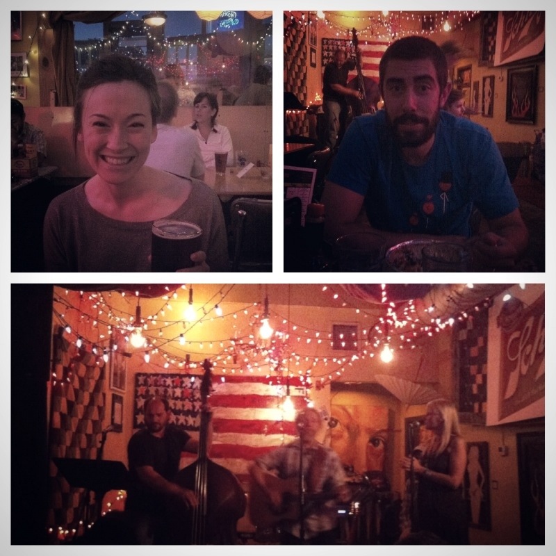 | For my birthday dinner we decided to go to the Family Wash to take advantage of the $10 pie and pint night. THE BEST! It’s really the birthday gift that keeps on giving because I was able to box up half of my shepherd’s pie and ate it for lunch the next day. Ah-mazing. The music was good but it was unbearably loud for one whole set – really, why is it necessary??? It’s such a small place! Javi’s face in the picture below is an immediate smile-to-startled reaction to a sudden howl in the mic. Pretty funny! All told, a great evening and a lovely, calm day! An added bonus: Javi and I are spending the weekend in California, escaping the unbearable Nashville heat. We’ll only be here til Sunday but it’s a very welcome break and sort of like an extended birthday celebration! | Para la cena de cumpleanos decidimos ir a Family Wash para aprovechar la noche de Pastel y cerveza por $10. LO MEJOR! Es el regalo de cumpleanos que se extiende porque pude guardar la mitad de mi pastel de papa para el almuerzo del otro dia. IN-CREIBLE. La musica estaba buena pero demasiado fuerte durante el primer set – en serio? porque es eso necesario??? Es un lugar muy pequeno! La cara de Javi en la foto de abajo es una reaccion inmediate a un ahullido en el microfono. Muy comico! Dicho todo esto, fue una noche genial y linda, para finalizar un dia muy tranquilo! Como bonus especial: Javi y yo vamos a pasar el fin de semana en California, escando del horroroso calor de Nashville. Estaremos aqui solo hasta el Domingo, pero es un descanso muy bienvenido y algo asi como una celebracion de cumpleanos extendida! |
