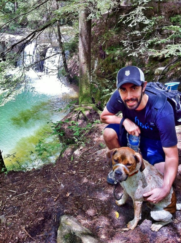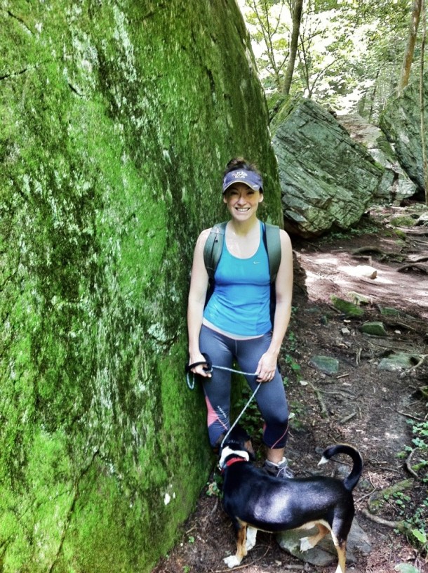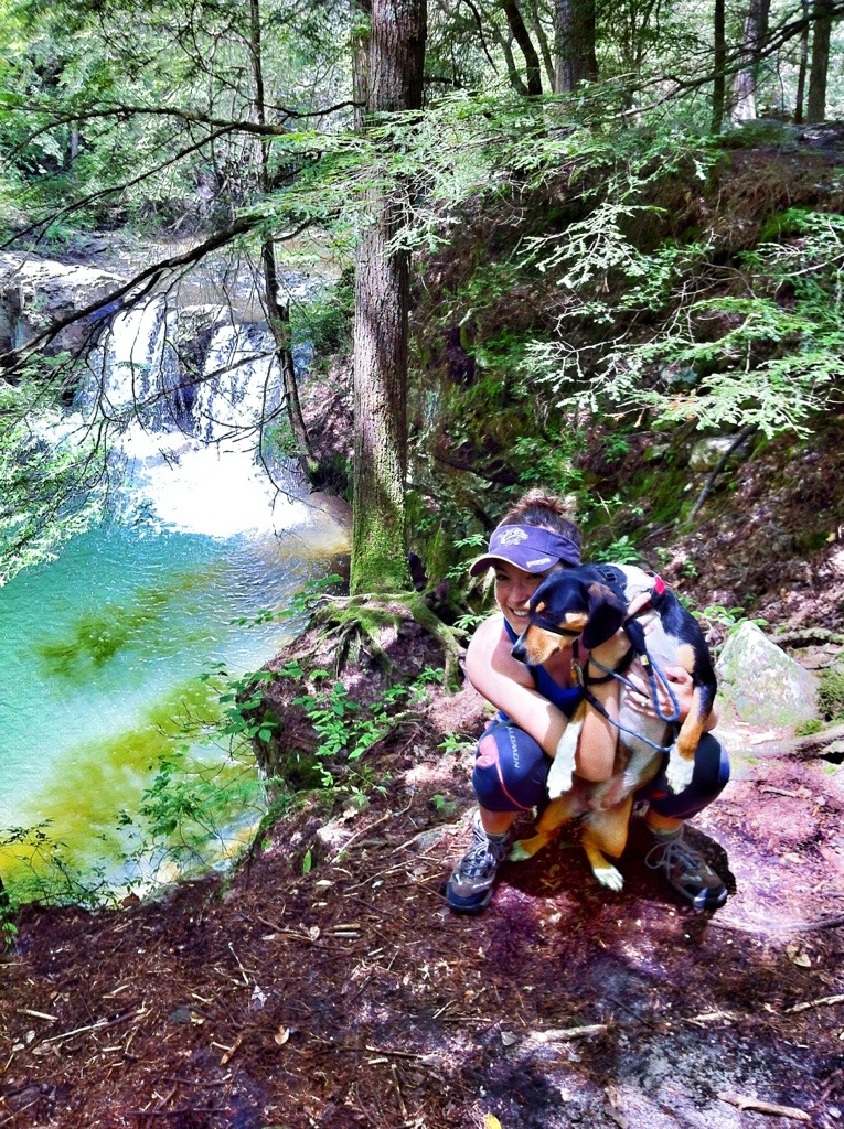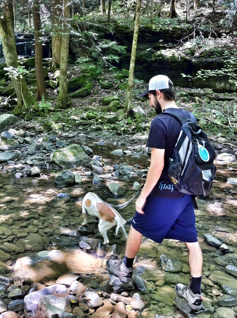| I was expecting a trail similar to Radnor or Edwin Warner, with some steep climbs but still a fairly easy hike. The Fiery Gizzard trail started out that way – pretty easy for the first 10 minutes or so. The rest of the time it was all walking along the edges of steep cliffs and climbing all over huge jagged rocks. The dogs (and especially Chupi) loved the trail! Chupete was in his element and I think he fancied himself a parkour specialist because he was leaping from rock to rock trying not to touch the ground. One time he bounced off the side of a rock and then missed the next one – poor guy’s ego was bruised after that and he chilled out a little bit. He even got in the stream, which was a big deal – he usually hates getting wet! Chori was a little more cautious – he made me walk upstream to find places to cross so he wouldn’t get his little paws wet (so weird) and he’d look where he was going before he’d leap down from a rock. Still, he loved it too and was always in front of me sniffing around and finding the best path for him. |