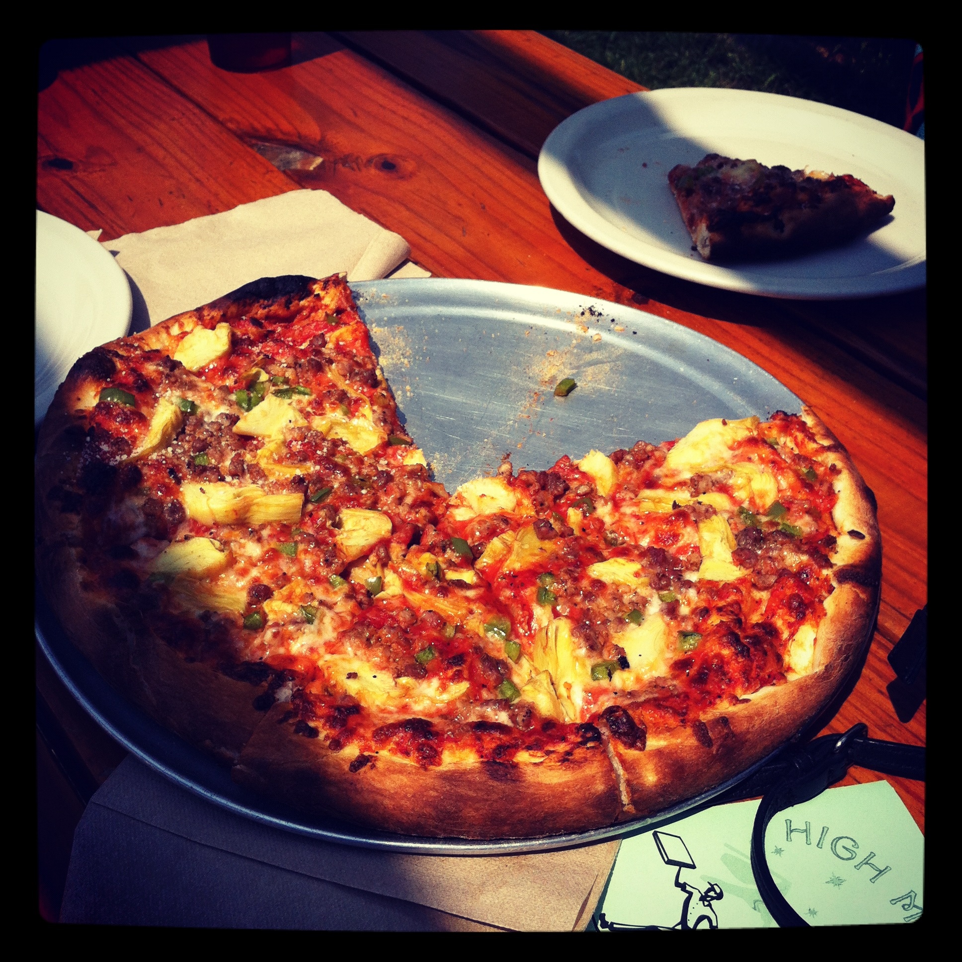 | We finished with the museum after about an hour and a half and went to lunch at a pizza place called High Mountain Pies. The pizza was delicious and the restaurant was really cute. They have a little terrace on the side of the building and then a big backyard with picnic tables where we sat and ate. After lunch we drove up rt. 91 and then got on I-70w and drove through Vail – beautiful scenery all the way of course – then got back on rt. 24 and headed back to Buena Vista. It was about a 2-hour drive through the mountains and we stopped about every 10 minutes at different lookout points to take photos and soak up the scenery. The weather was sunny and mid-70s – absolutely perfect! | Estuvimos en el museo por una hora y media y nos fuimos a almorzar a una pizzeria llamada High Mountain Pie. La pizza estaba deliciosa y el restaurant era muy lindo. Tenia un terraza al lado del edificio y tambien un patio trasero muy grande con mesas de picnic donde nos sentamos a comer. Despues de almorzar manejamos por la ruta 91 y despues tomamos la interestatal 70W y manejamos rumbo a Vail – hermosos paisajes – luego tomamos la ruta 24 y nos devolvimos a Buena Vista. Fueron mas o menos 2 horas de viaje por las montanas y paramos cada 10 minutos en distintos miradores a sacar fotos y disfrutar el paisaje. El tiempo estaba soleado y 22 grados – perfecto! |