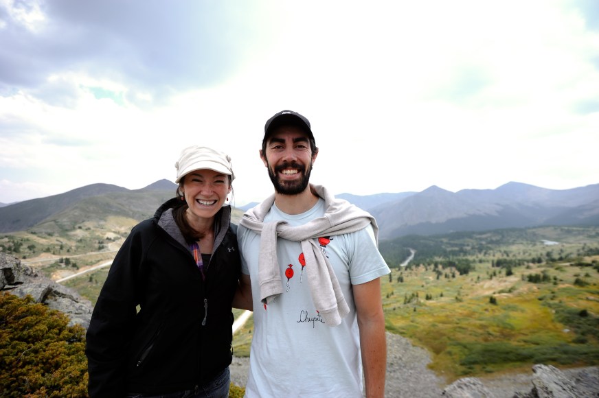 | When Javi and I didn’t have anything planned during our stay in Buena Vista we went hiking on different trails. Our friend Jen recommended Angel Falls and our B&B host Connie told us to check out Cottonwood Pass, so we decided to take them both up on their suggestions. In between horseback riding and the goat farm, we drove up to Cottonwood Pass to check out the view. We parked our car at the bottom of a big hill and climbed up to the very top of the pass – in my cowboy boots no less – and it was just gorgeous. For the first 10 minutes we were up there nobody was up there with us, so we set the timer of our camera to take photos and in my rush to try to join Javi I started falling over backwards, scaring Javi half to death (I was fine! I swear!). We finally met up with a nice couple who seemed camera savvy enough and asked them to take a photo and…well, we finally got one after a few tries! I was smiling so hard – do you think I was happy or what? |