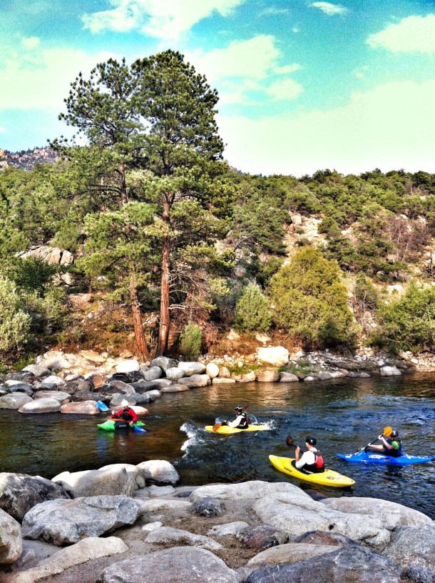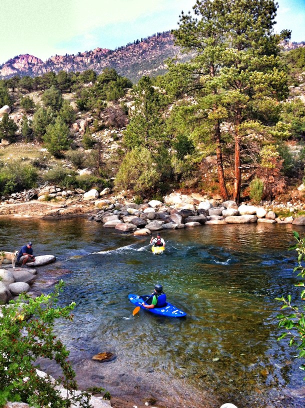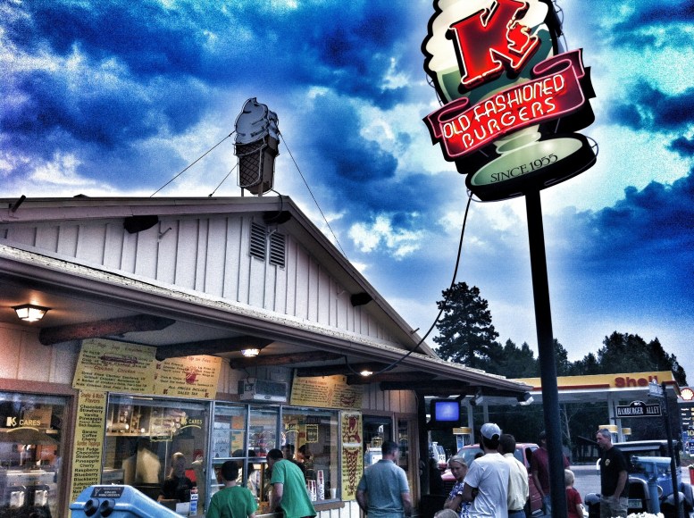 After the museum we relaxed around Buena Vista, hanging out by the river watching kayakers pass and drinking coffee on Main St. My cousin Andrew and his fiancee Camala were driving in later that night so in the meantime we went to Twin Lakes and watched the sun set, took a few photos and headed back to Buena Vista for dinner at a local burger / shake joint called K’s. It reminded us of Bobbie’s Dairy Dip – the same concept, burgers, 50’s atmosphere, dipped cones and shakes – delicious. We decided to take Andrew’s advice and load up on calories since we’d be burning upwards of 7,000 calories on the climb, so we enjoyed burgers and sundaes until Andrew and Camala and their friend Ryan met us to go check into our next lodging at the Cottonwood Hot Springs! Not much else to say about that night – we just caught up with Andrew and Camala and hung out with their pup Simba before heading to sleep…with the thought of climbing Mt. Princeton looming. Can’t wait to post about that – check back Monday to hear about our amazing climb up a 14,000 ft. mountain! Despues del museo nos relajamos dando vueltas en las calles de Buena Vista, pasando el rato al lado del rio viendo a la gente en kayaks y tomando cafe en la calle principal. Mi primo Andrew y su prometida Camala manejaban esa tarde a juntarse con nosotros asi que por mientras fuimos a Twin Lakes a ver la puesta de sol, sacamos algunas fotos y volvimos a Buena Vista para cenar en una picada de hamburguesas llamada K’s. Nos recordo de Bobbie’s Dairy Dip – el mismo concepto, hamburguesas, atmosfera de los 50, helados banados en chocolate – delicioso. Decidimos hacerle caso al consejo de Andrew sobre consumir calorias ya que ibamos a quemar mas o menos 7000 calorias en la subida a la montana, asi que disfrutamos las hamburguesas y helados hasta que Andrew, Camala, y su amigo Ryan nos encontraron para ir a registrarnos a las termas Cottonwoods! No hay mucho mas que decir sobre esa noche – solo conversamos y pasamos el rato con su perrito Simba antes de irnos a dormir….pensando en la idea de subir el monte Princeton. No puedo esperar a postear sobre eso – revisen el lunes para leer sobre nuestra increible subida de una montana de 14,000 pies de altura!