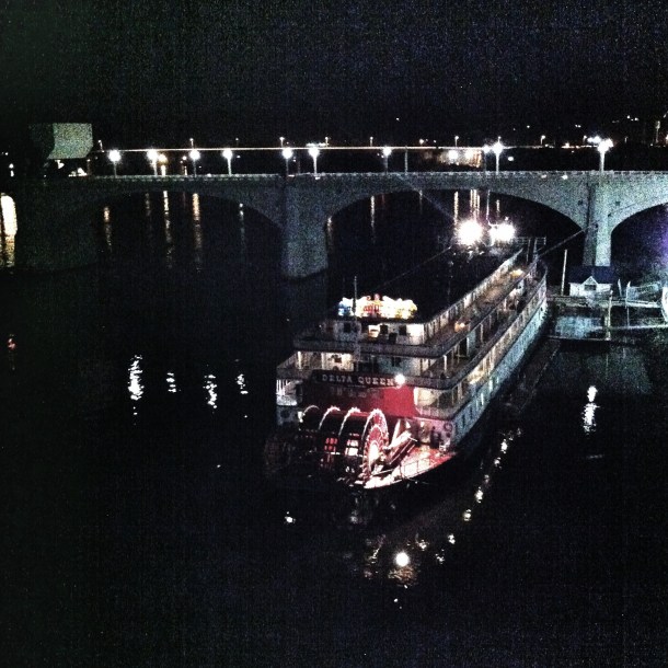 | On Saturday night we drove to Chattanooga for dinner and then took a stroll on a walking bridge over the Tennessee River. Saturday night was the real adventure – we slept inside the sailboat!! Javi and I had the option of the blowup mattress in the living room or sleeping inside the sailboat – and really, when you get the chance to sleep in a boat can you really pass it up?! We were excited to act like real sailors for the night and sleep in the bunks inside the boat (inside the Duchess sounds a little off huh?). There was no AC but we had a fan and we slept pretty soundly! On Sunday morning we woke up and went with Melissa to the Soddy Daisy flea market. I came away with a ton of tiny bottles to put on the windowsill for roses and a new (old) perfume bottle that Javi cleaned out and filled with my perfume. So cool! | El Sábado en la noche, manejamos rumbo a Chattanooga para cenar y dimos un paseo por el puente de peatones que cruza el rio Tennessee. El Sábado en la noche fue una real aventura – dormimos dentro del velero!!! Javi y yo teniamos la opcion de un colchon inflable en el living o dormir en el bote – y en serio, cuando tienes la oportunidad de dormir en un bote, se puede dejar pasar?! Estabamos felices de actuar como marineros por una noche y dormir en la literas dentro del bote (dentro de la Duquesa suena un poco extrano no?) No habia aire acondicionado pero lo pasamos bien y dormimos como rocas! El Domingo en la manana nos despertamos y fuimos con Melissa a la feria de las pulgas de Soddy Daisy. Sali con un monton de botellitas para poner rosas en las ventanas y una botella antigua con atomizador para poner perfume. Javi la lavo y puso mi perfume en ella. Genial! |