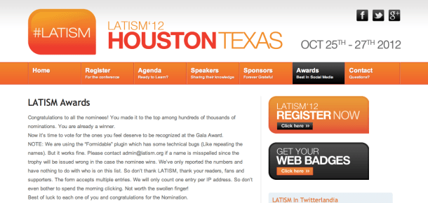 One really cool wordpress stats feature is that you can see the “referrers” to the blog – or the various sites that direct people to losrodriguezlife.com. Most of the time for us this includes facebook, twitter, stumbleupon, pinterest, or search engines, but today Javier and I noticed that we were getting some referral from conference.latism.org. We clicked on the link and lo and behold, we were nominated under the “Best Bilingual Blogger” category for the Best of Social Media LATISM awards! Una de las opciones mas bakanes de WordPress es que puedes ver los sitios que promueven tu pagina – o los distintos sitios que dirigen gente a losrodriguezlife.com. La mayoria del las veces estos sitios incluyen facebook, twitter, stumbleupon, pinterest, o búsquedas en buscadores de internet, pero hoy notamos que estabamos recibiendo trafico de conference.latism.org. Hicimos click en el link y ahi estaba, fuimos nominados en la categoría “Mejor Blog Bilingue” para los premios a Mejor LATISM en Medios Sociales!