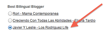 Notice the key word there was almost – we would sure love to actually win this award! So here is where you can help us – would you please follow this link and vote for us under the “best bilingual blogger” category? Just click the little dot next to our name, then hit submit at the bottom and that’s it! No need to register. We’d REALLY appreciate your help!! Noten que la palabra clave es “casi” – de seguro nos encantaria ganar el premio! Asi que aqui es donde les pedimos ayuda – por favor sigan este link y voten por nosotros en la categoría “best bilingual blogger” Solo hagan click en el circulo junto a nuestro nombre, y luego hagan click en “submit” al final de la pagina, y eso es todo! No se tienen que registrar. En verdad les agradecemos la ayuda!!