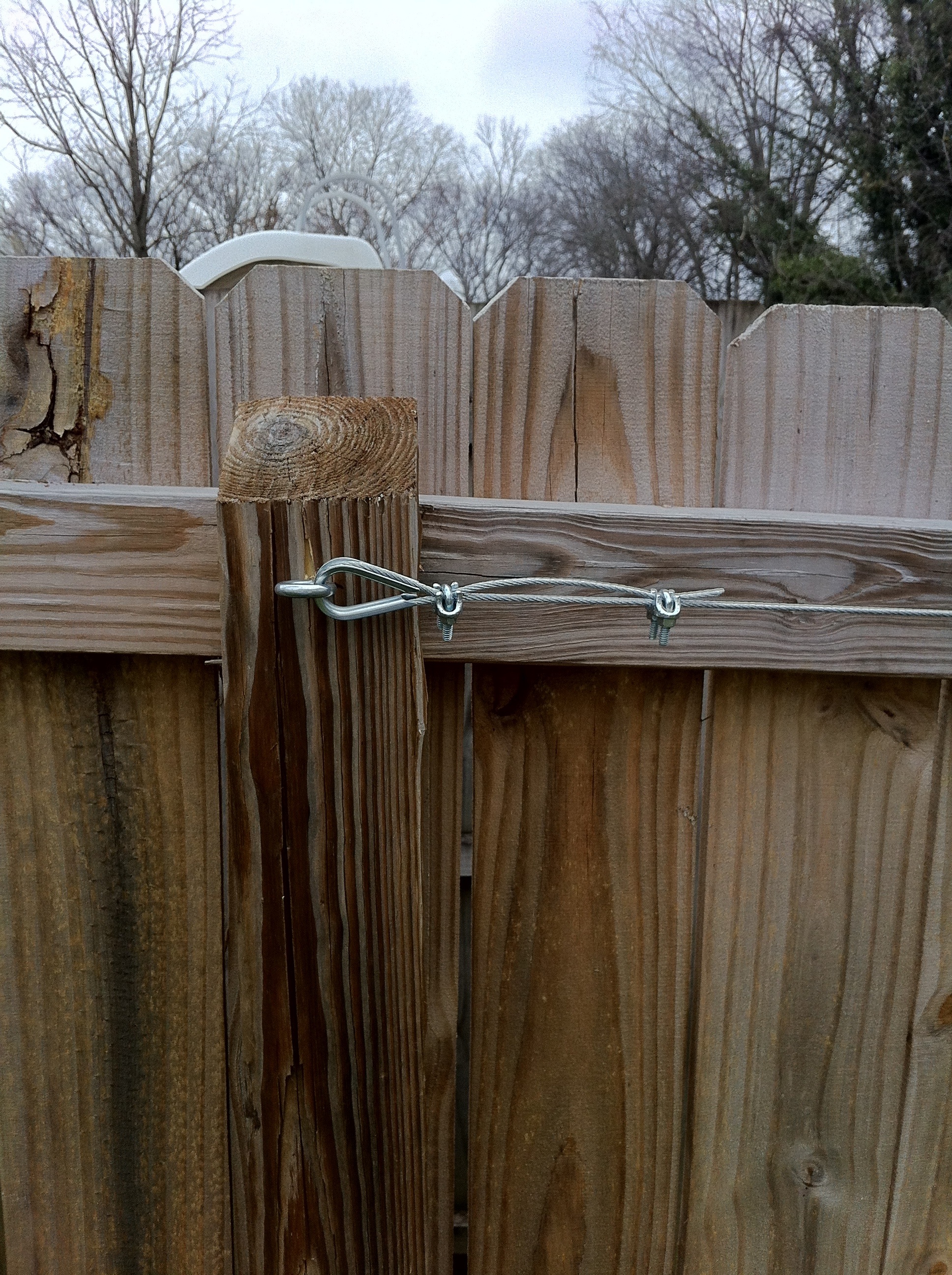 For the grapes I am going to plant 4 vines. These vines have to be trained to yield good amounts of fruit and to cover the fence in the directions we want. I installed cable rope using eye bolts in our fence posts (I found a ton of videos on youtube on how to do this and what hardware to use), so each vine has cable to grow horizontally and provide support. One cable is at 3 feet and the other at about 5 1/2 feet. Para las uvas, voy a plantar 4 plantas. Estas plantas tienen que ser entrenadas para que den mucha fruta y para que cubran le cerco en la dirección que queremos. Instale cable usando ganchos en nuestros postes (encontré un montón de videos en youtube que muestran como hacerlo y que materiales usar), así que cada planta tendrá cable para crecer horizontalmente y dar soporte. Un cable esta a 3 pies del suelo y el otro a 5 1/2 pies.