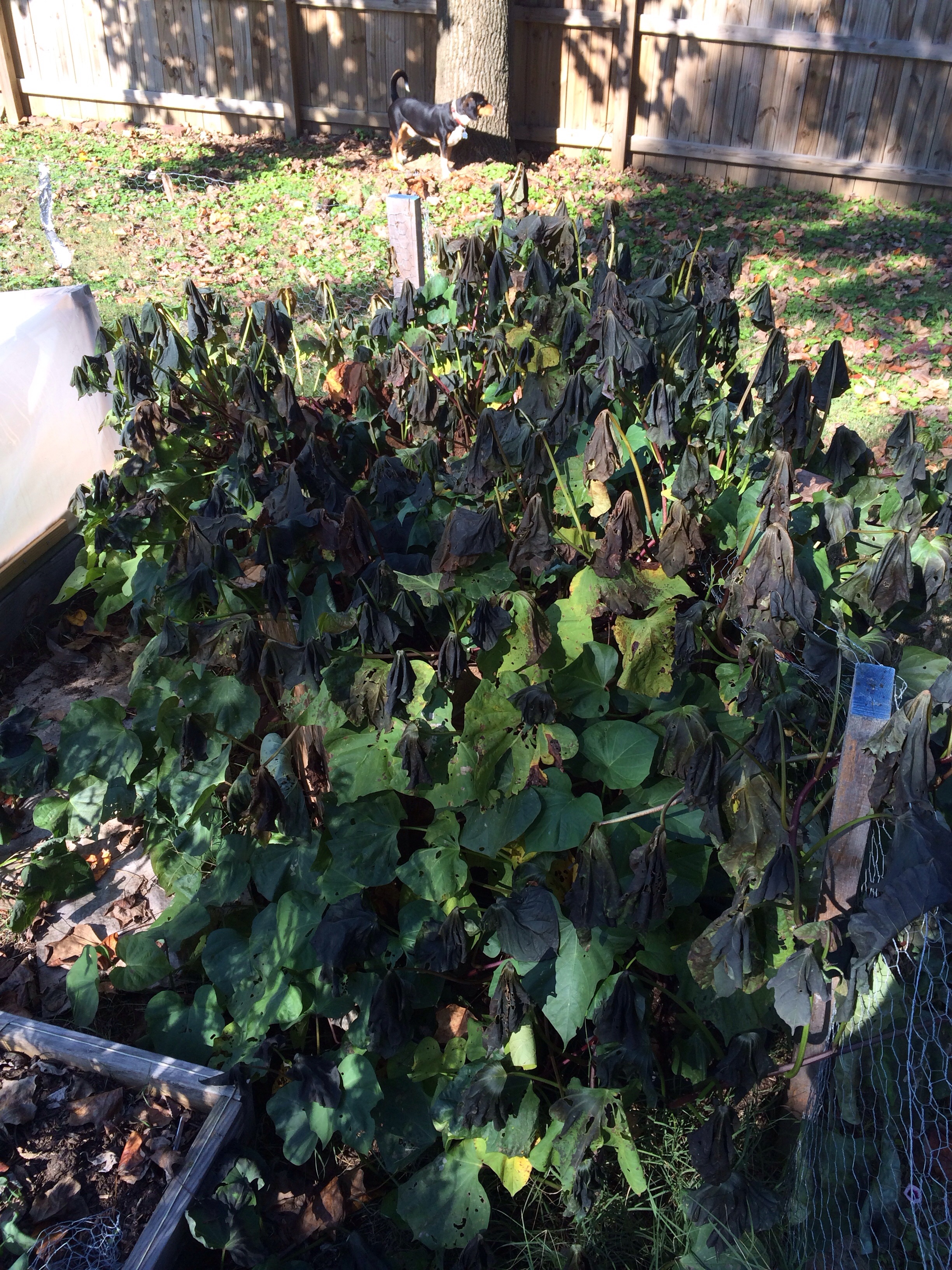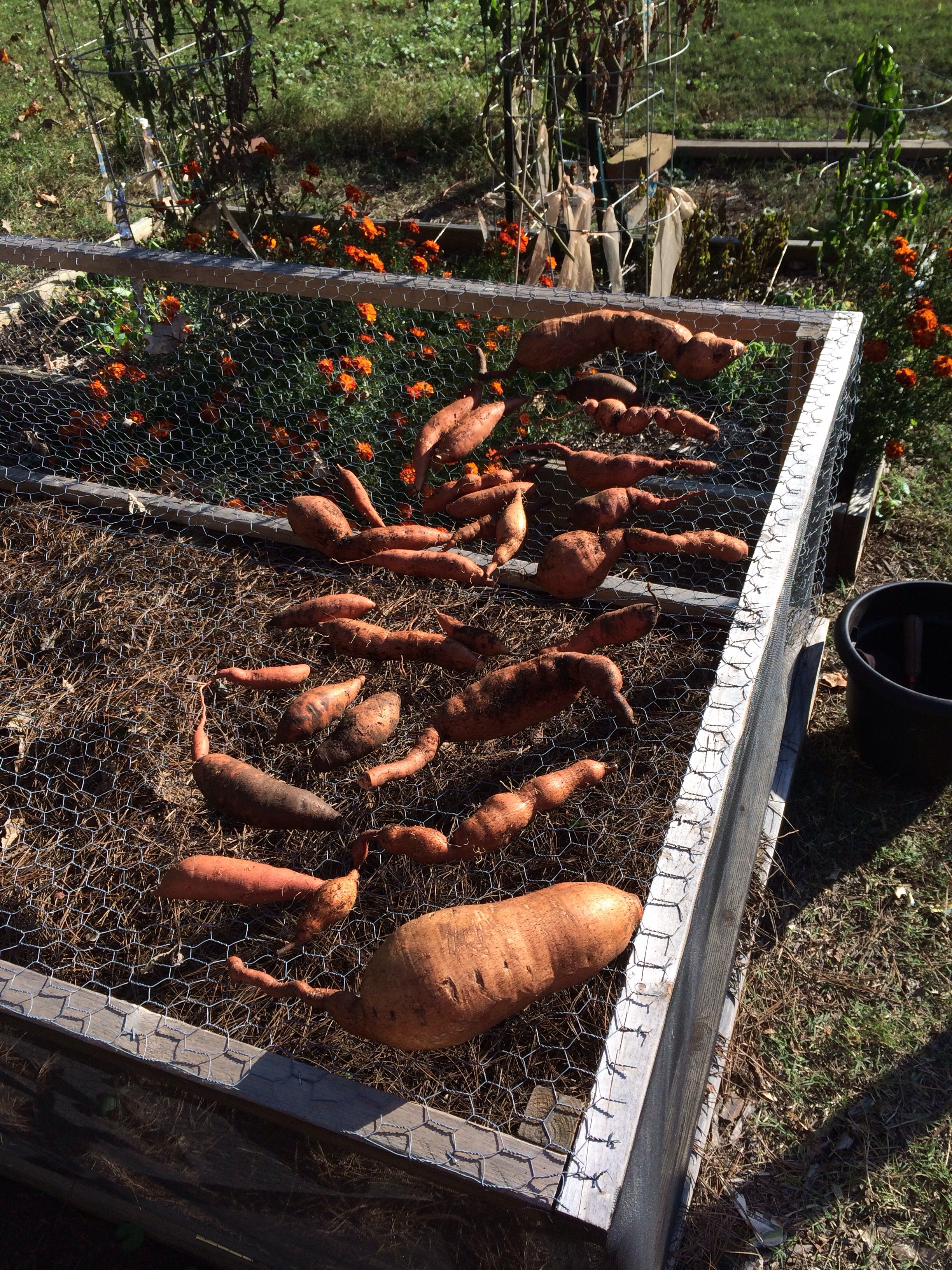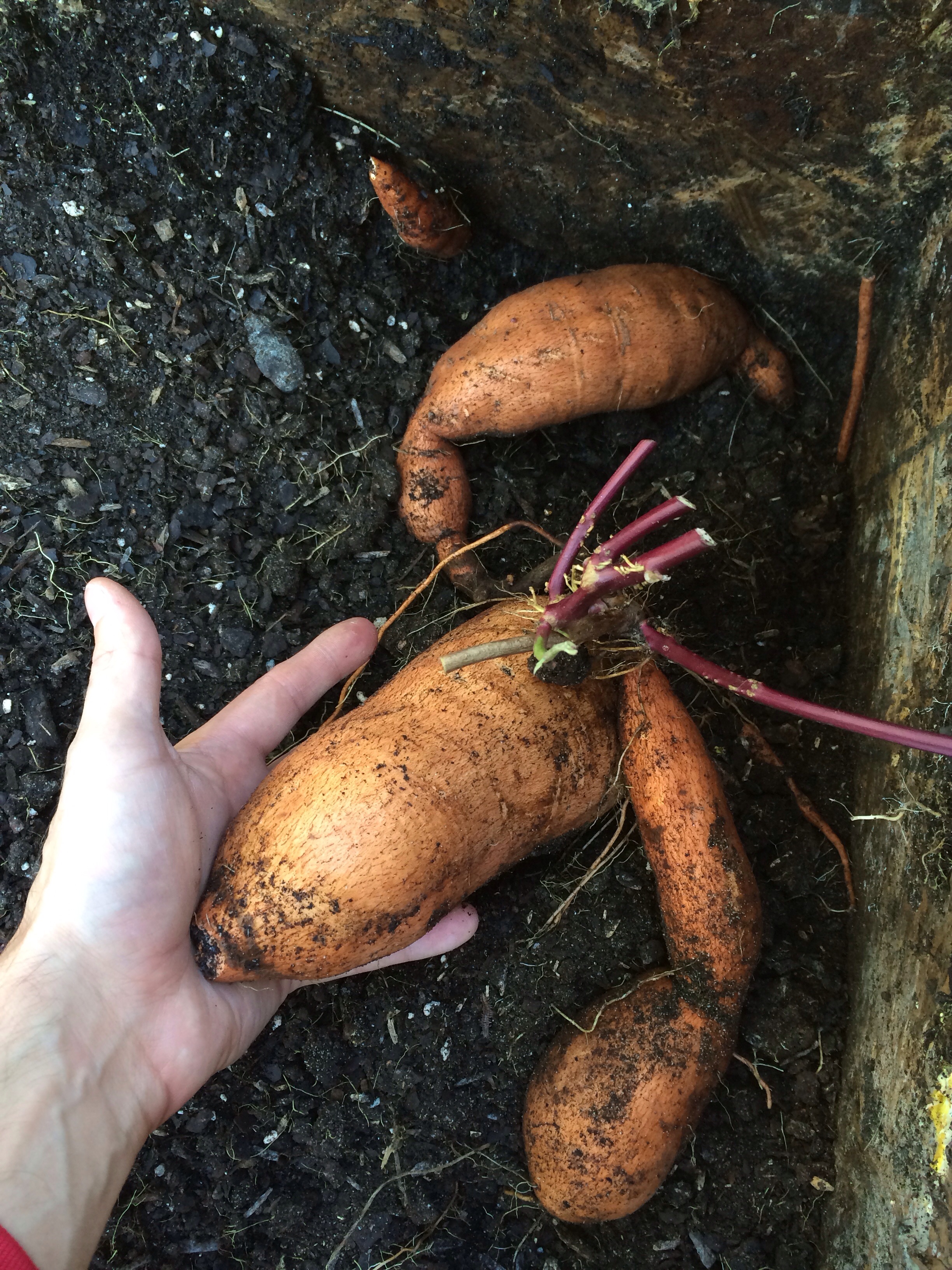 So for those thinking about growing sweet potatoes here is what I did and learned this season:-       I planted the slips once there was no chance of night temperatures under 60°-       I watered the vines often-       I did not touch them. I let them grow freely.-       I harvested immediately after the first light frost Asi que para aquellos que quieren crecer camotes, esto es lo que hice y aprendi esta temporada:–      Plante las plantas cuando no habia mas posibilidades de temperaturas bajo los 15°–      Regue las plantas seguido–      No las toque y la deje crecer libremente–      Coseche de inmediato after de la primera helada