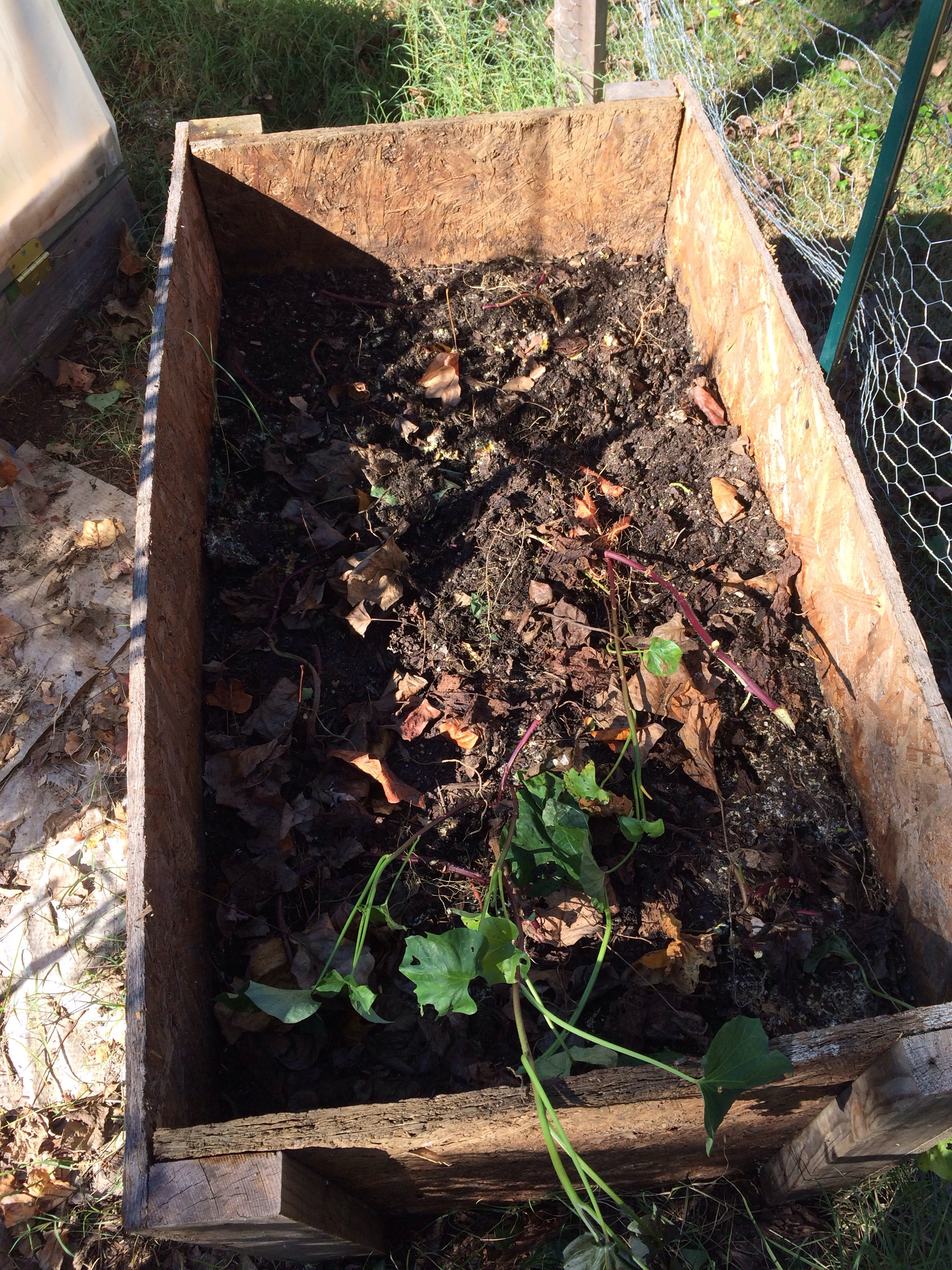 Sweet Potatoes are a sign of fall. Last year my experiment with growing sweet potatoes was disappointing. The vines grew nicely, but I ended up with just a couple of decent sized potatoes. This season I was determined to do better (which was not so hard after last season’s low standard) so this year I set up a box just for the sweet potatoes. The box was filled with about 16 inches of rich, loose soil. I left the vines untouched for the entire season, except for watering, until the first frost hit middle Tennessee. Camotes son una senal del otono. El ano pasado experimente plantando camotes pero fue un buen experimento. Las plantas crecieron bien, pero solo crecieron un par de camotes. Esta temporada estuve decidido en mejorar (lo que no fue dificil despues de una mala primera temporada) asi que este ano hice una jardinera solo para camotes. La jardinera la llene con mas o menos 40 centimetros de tierra suelta y rica en nutrientes. No toque las plantas durante toda la temporada, pero si las regue, hasta que la primera helada llego a Tennessee.