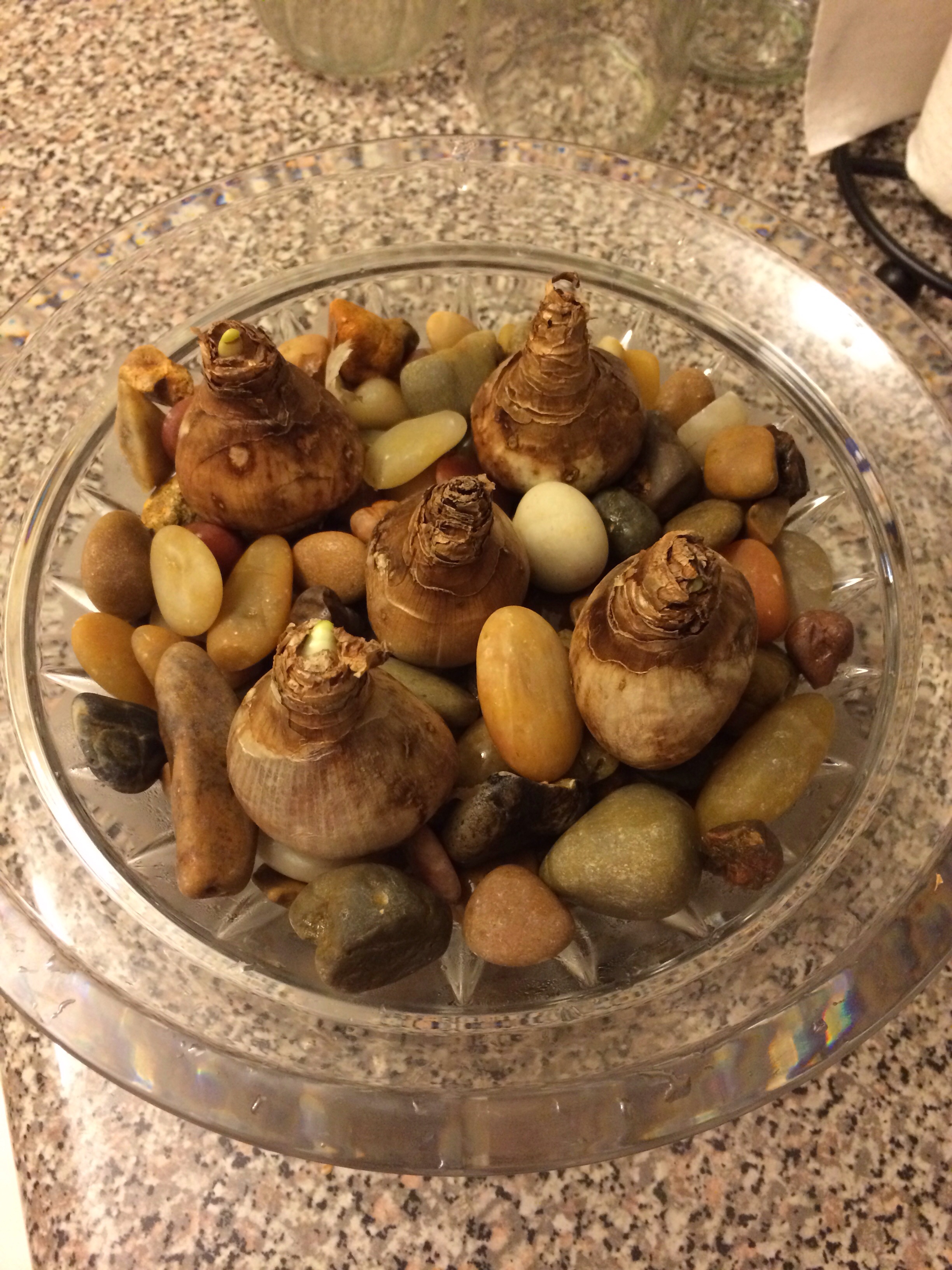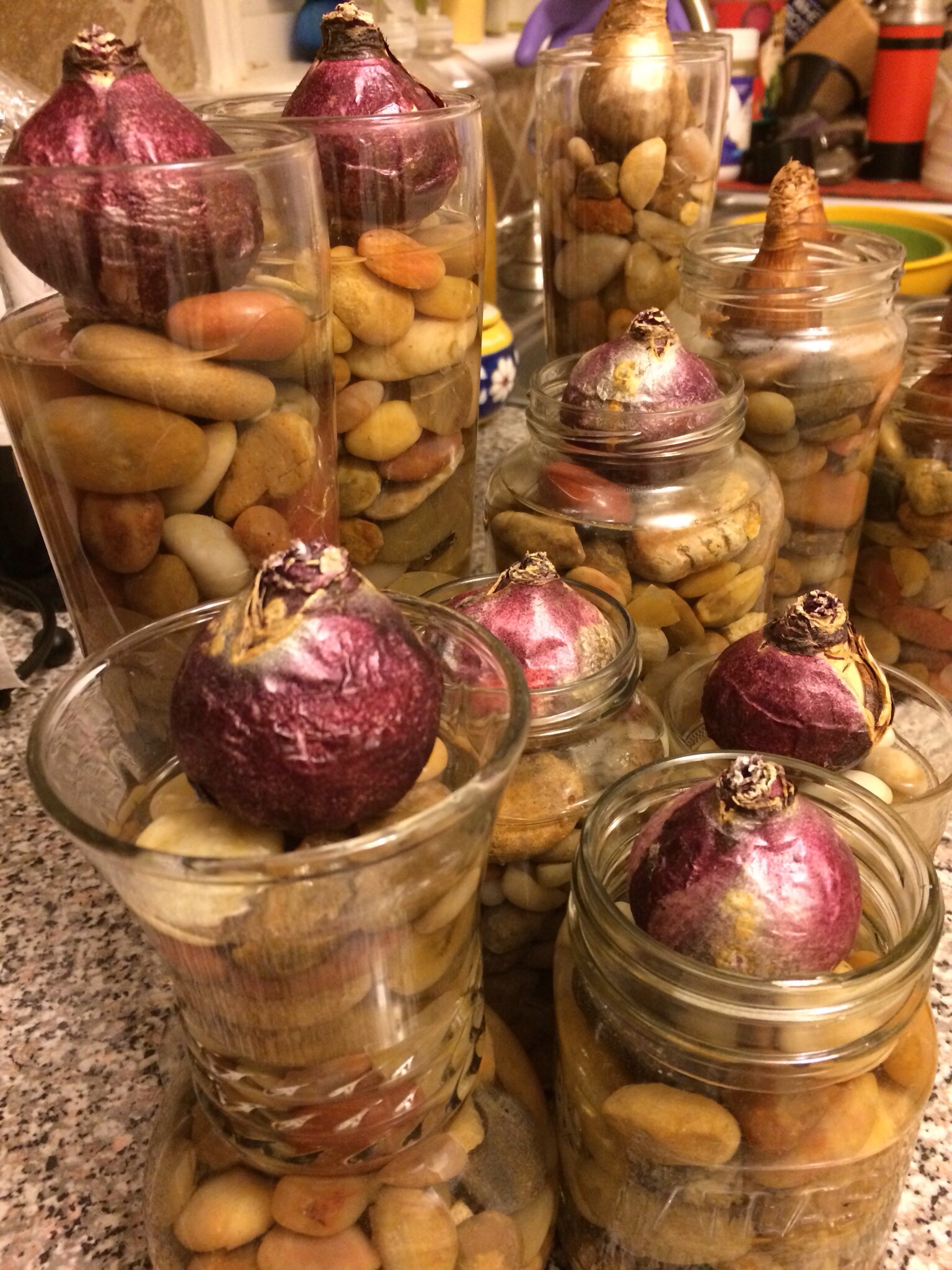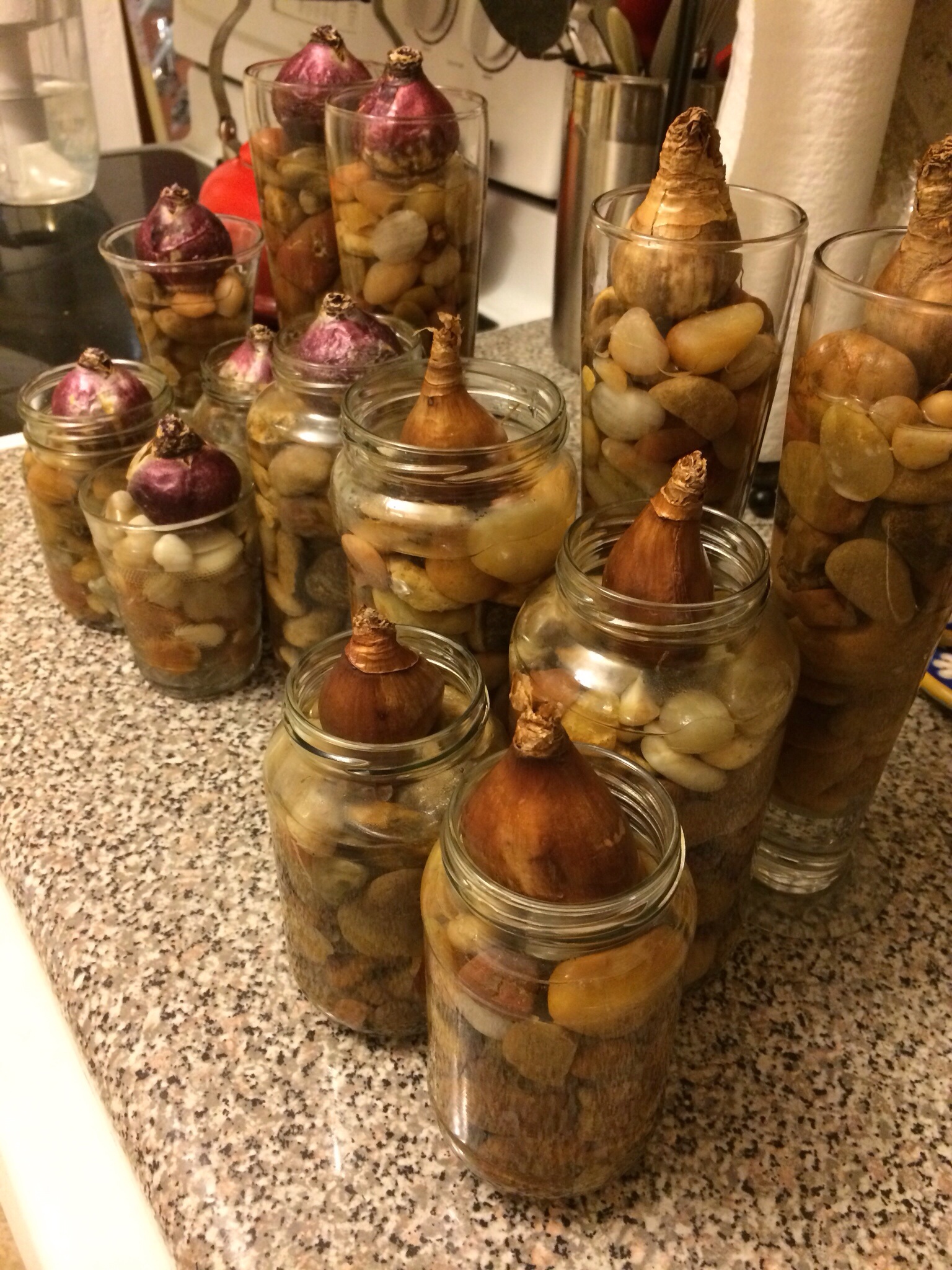 | The hundreds of bulbs that we planted outside will take a long time to flower…but we want flowers soon!! Luckily for us, mother nature gives us some opportunities to change the course of things a little bit without making a catastrophic disaster happen. So what are we doing? We are forcing bulbs to grow inside. I saw the idea online and we are giving it a shot to see if we can grow flowers during the winter time. | Los cientos de bulbos que plantamos afuera se demoraran bastante en florecer…pero queremos flores ahora ya!!! Por suerte para nosotros, la madre naturaleza nos da la oportunidad de cambiar un poquito el curso de algunas cosas si generar catastrofes. Que hemos hecho? Vamos a forzar los bulbos pra que crezcan dentro de la casa. La idea la vi en la internet y vamos a intentar para ver si podemos hacer crecer esas flores durante el invierno. |