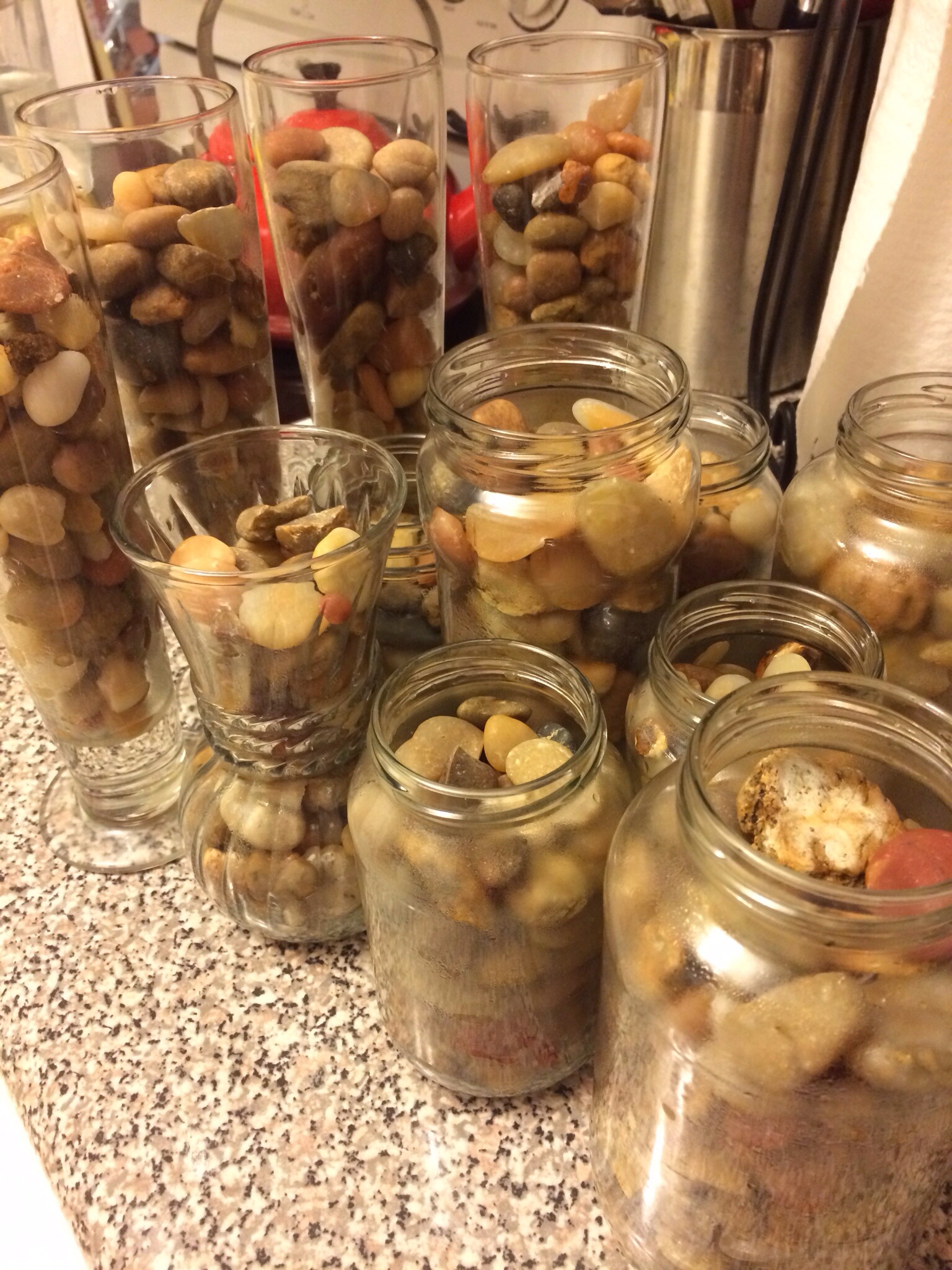 | We had a bunch of jars around the house (I have a hard time throwing them away – surely they’ll be useful someday) so we are using them as flower vases. We bought some daffodil and hyacinth bulbs – they were on sale because the season of planting bulbs is about to end – and also some river rocks pebbles. So here is what we did…we washed the pebbles and filled up all the jars. Then we filled the jars up with water just to the edge of the top layer of rocks, and then we placed the bulbs on top of the rocks. The idea is to have the bulbs barely touch the water – you don’t want them under the water because they could rot. So now we just need to wait and see if they will decide to grow! Hopefully they will so we can enjoy a little bit of spring during winter 🙂 Mother nature spoils us! | Teniamos un monton de jarros en la casa (siempre me cuesta tirarlos a la basura – pienso que en algun momento seran utiles) asi que los vamos a usar como floreros. Compramos algunos narcisos y unos jacintos – estaban en oferta porque la temporada para plantarlos ya se acaba – y tambien compre piedras de rio. Esto fue lo que hicimos…lavamos las piedras y llenamos los jarros. Luego los llenamos con agua justo al nivel de las piedras, y pusimos los bulbos encima. La idea es que los bulbos apenas toquen el agua – no quieres que esten sumergidos porque se pudren. Asi que ahora tenemos que esperar a ver si se deciden a crecer! Ojala lo hagan asi podemos disfrutar de un poquito de primavera durante el invierno 🙂 La madre naturaleza nos trata bien! |