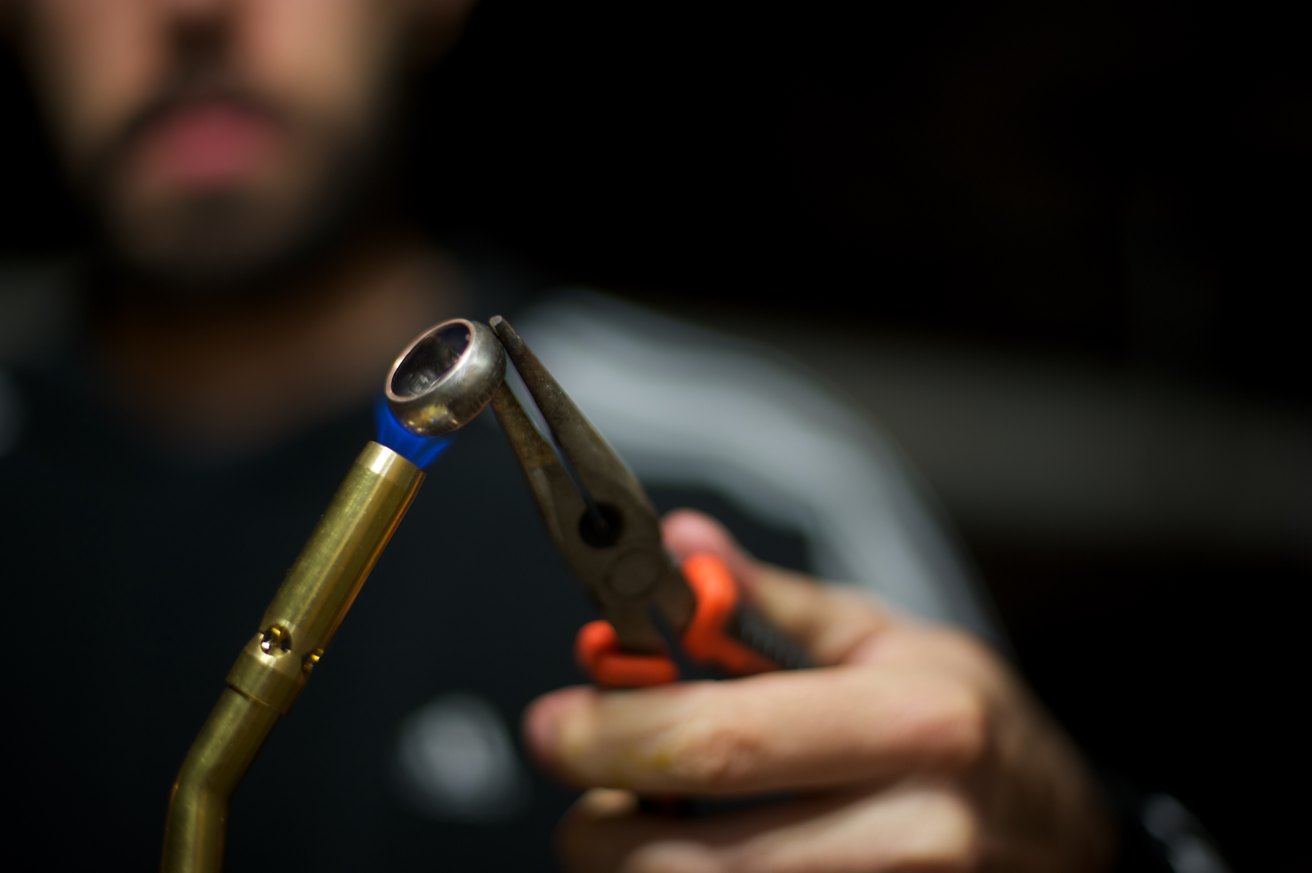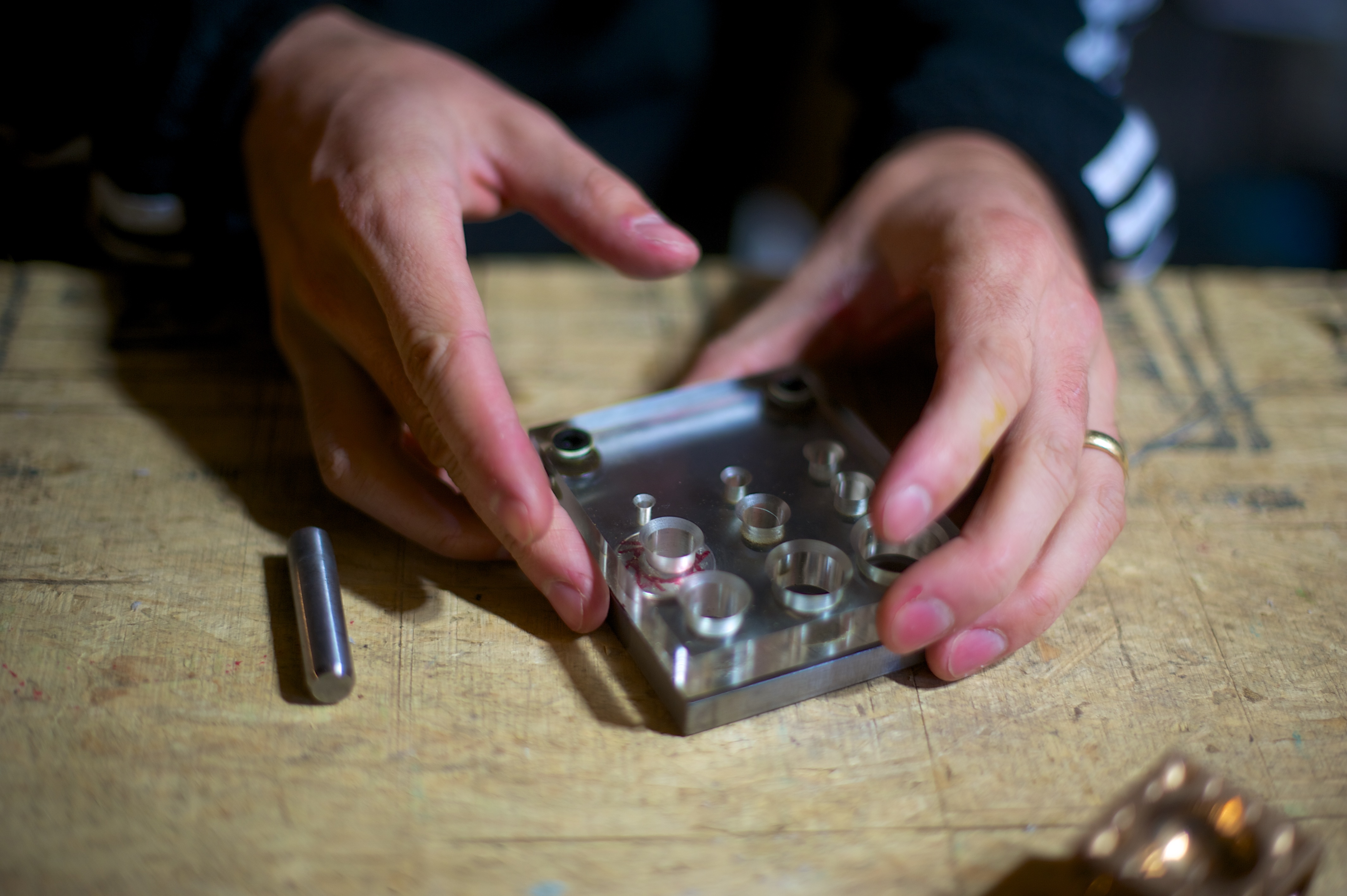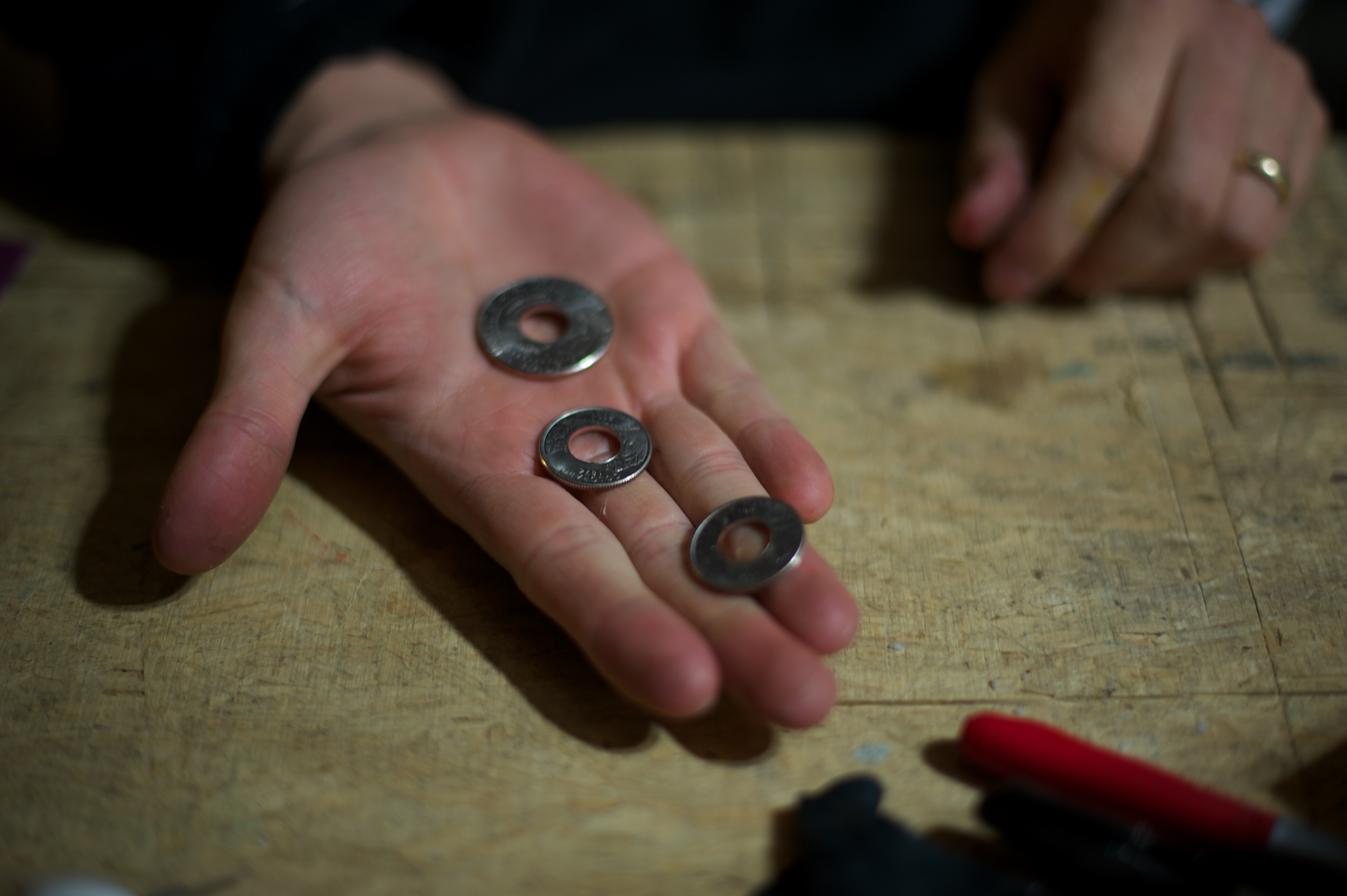 | He bought all of the right tools and set them up in the basement so now he can continue making rings from all different kinds of coins. The reason we waited this long to post about it (which was a challenge for me, let me assure you) was because he decided to make 7 rings out of quarters for his family members in Chile and bring them as a surprise. He’s got it down to a science now and can make them in about an hour. He wound up buying an additional polishing tool because the heat to mold them into shape turns them black and it’s time consuming and difficult to manually wipe them clean again. After he made mine I went down and took photos of the whole process. We’ve been together 7 years now (5 years married) and he never ceases to amaze me. | Compro todas las herramientas necesarias y las puso en el subterraneo para poder continuar haciendo anillos de diferentes tipos de monedas. La razon por la cual esperamos tanto para escribir sobre estos (lo que fue dificil para mi, se los aseguro) fue que decidio hacer 7 anillos de monedas de ¼ de dolar para sus familiares en Chile y llevarselos como sorpresa. Ahora con practica puede hacer un anillo en menos de 1 hora. Termino comprando mas herraminetas para pulir los anillos, ya que hacerlo manualmente tomaba la maor parte del tiempo. Despues que me entrego el mio, saque fotos de todo el proceso. Hemos estado juntos 7 anos (5 casados) y nunca me deja de sorprender. |