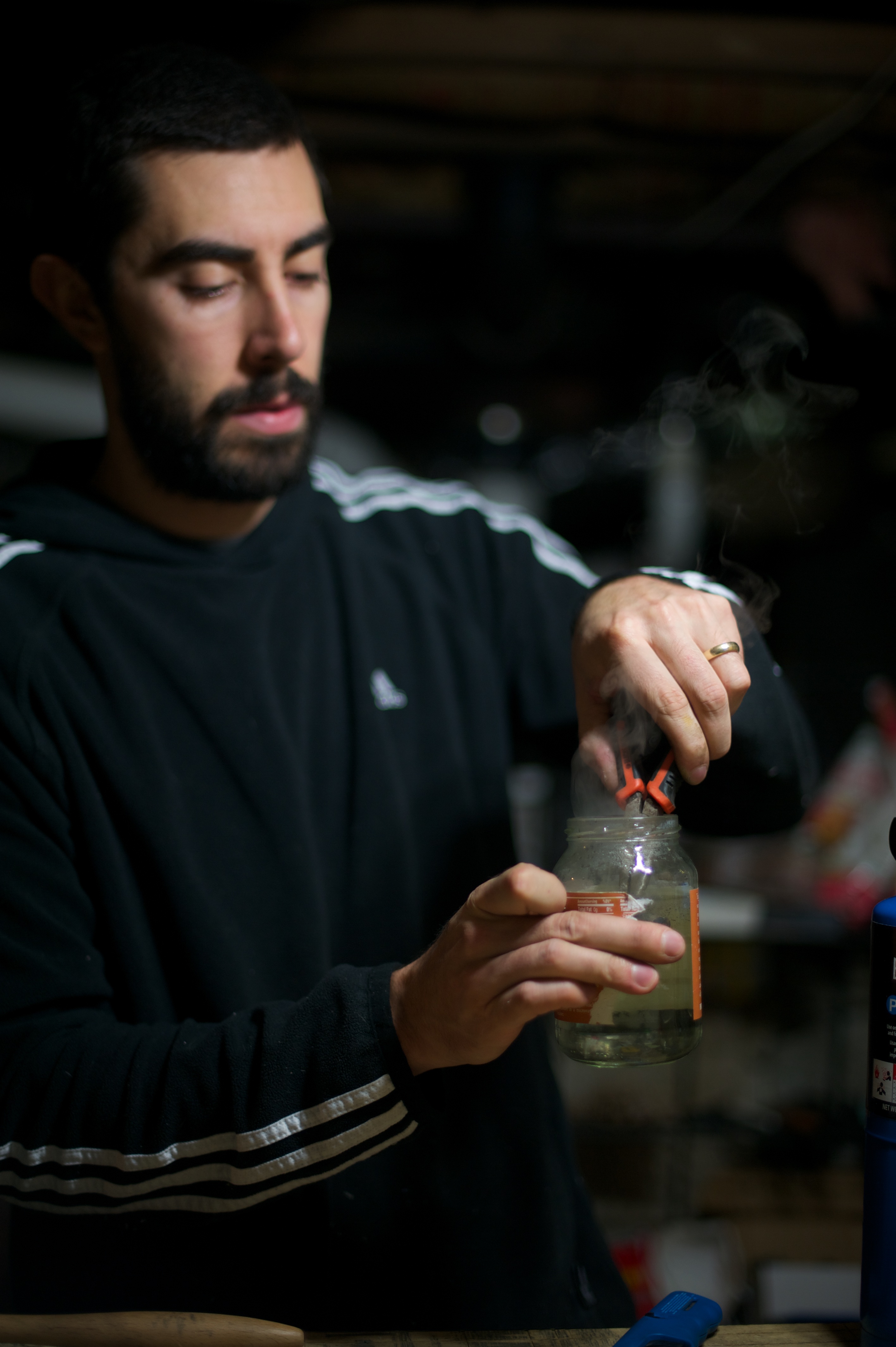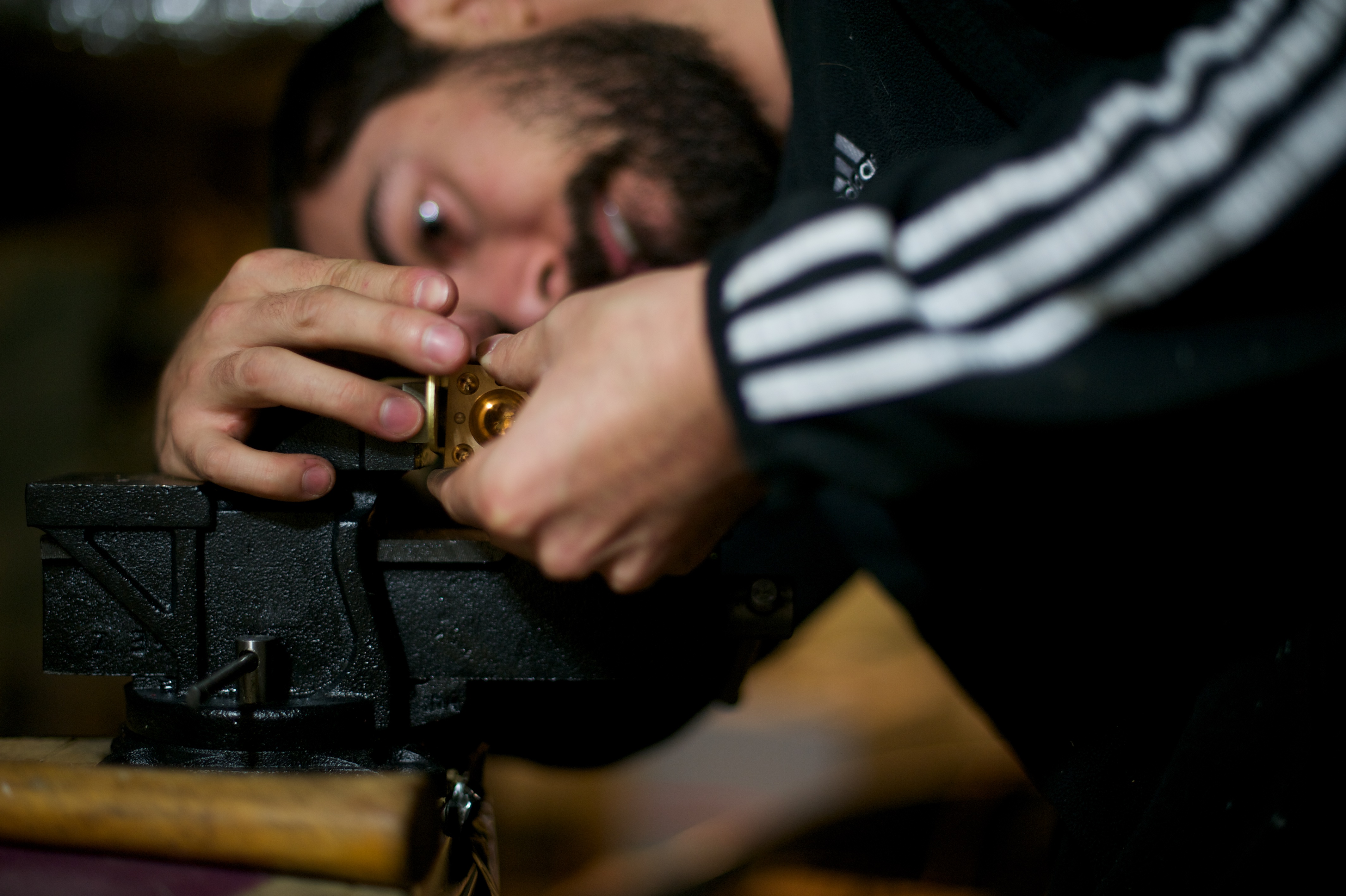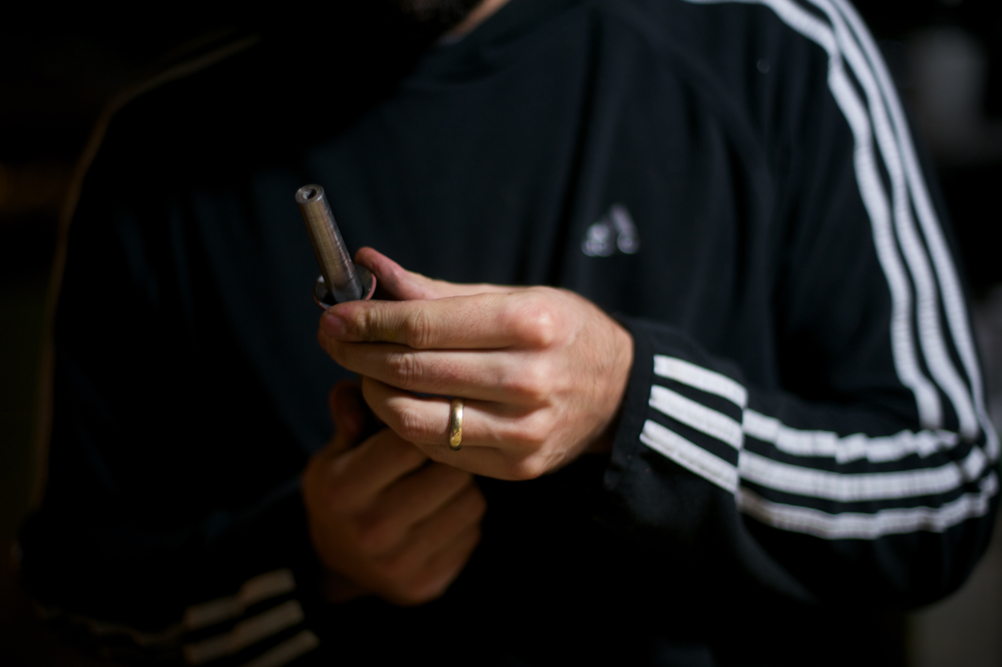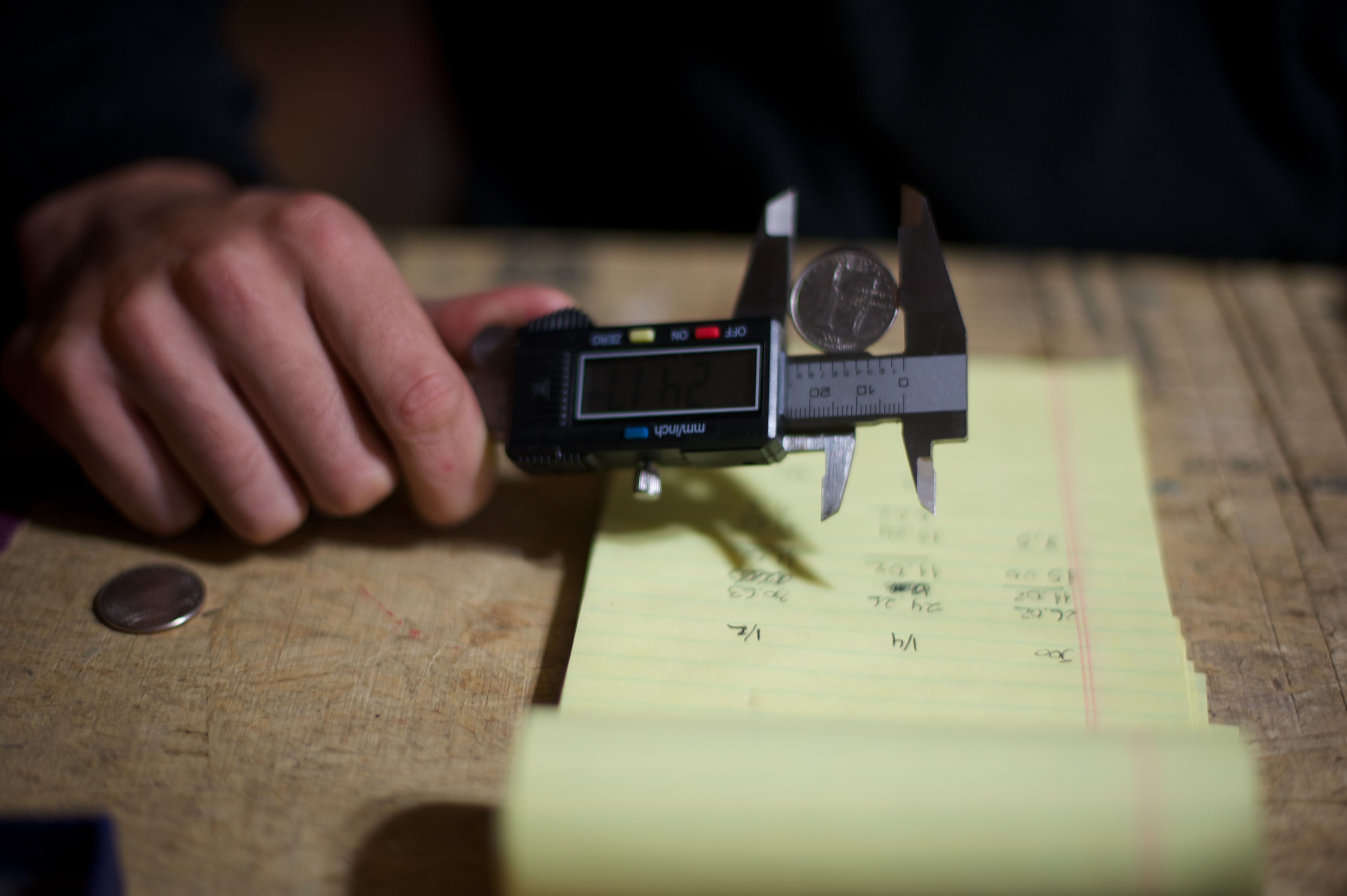 | He bought all of the right tools and set them up in the basement so now he can continue making rings from all different kinds of coins. The reason we waited this long to post about it (which was a challenge for me, let me assure you) was because he decided to make 7 rings out of quarters for his family members in Chile and bring them as a surprise. He’s got it down to a science now and can make them in about an hour. He wound up buying an additional polishing tool because the heat to mold them into shape turns them black and it’s time consuming and difficult to manually wipe them clean again. After he made mine I went down and took photos of the whole process. We’ve been together 7 years now (5 years married) and he never ceases to amaze me. | Compro todas las herramientas necesarias y las puso en el subterraneo para poder continuar haciendo anillos de diferentes tipos de monedas. La razon por la cual esperamos tanto para escribir sobre estos (lo que fue dificil para mi, se los aseguro) fue que decidio hacer 7 anillos de monedas de ¼ de dolar para sus familiares en Chile y llevarselos como sorpresa. Ahora con practica puede hacer un anillo en menos de 1 hora. Termino comprando mas herraminetas para pulir los anillos, ya que hacerlo manualmente tomaba la maor parte del tiempo. Despues que me entrego el mio, saque fotos de todo el proceso. Hemos estado juntos 7 anos (5 casados) y nunca me deja de sorprender. |