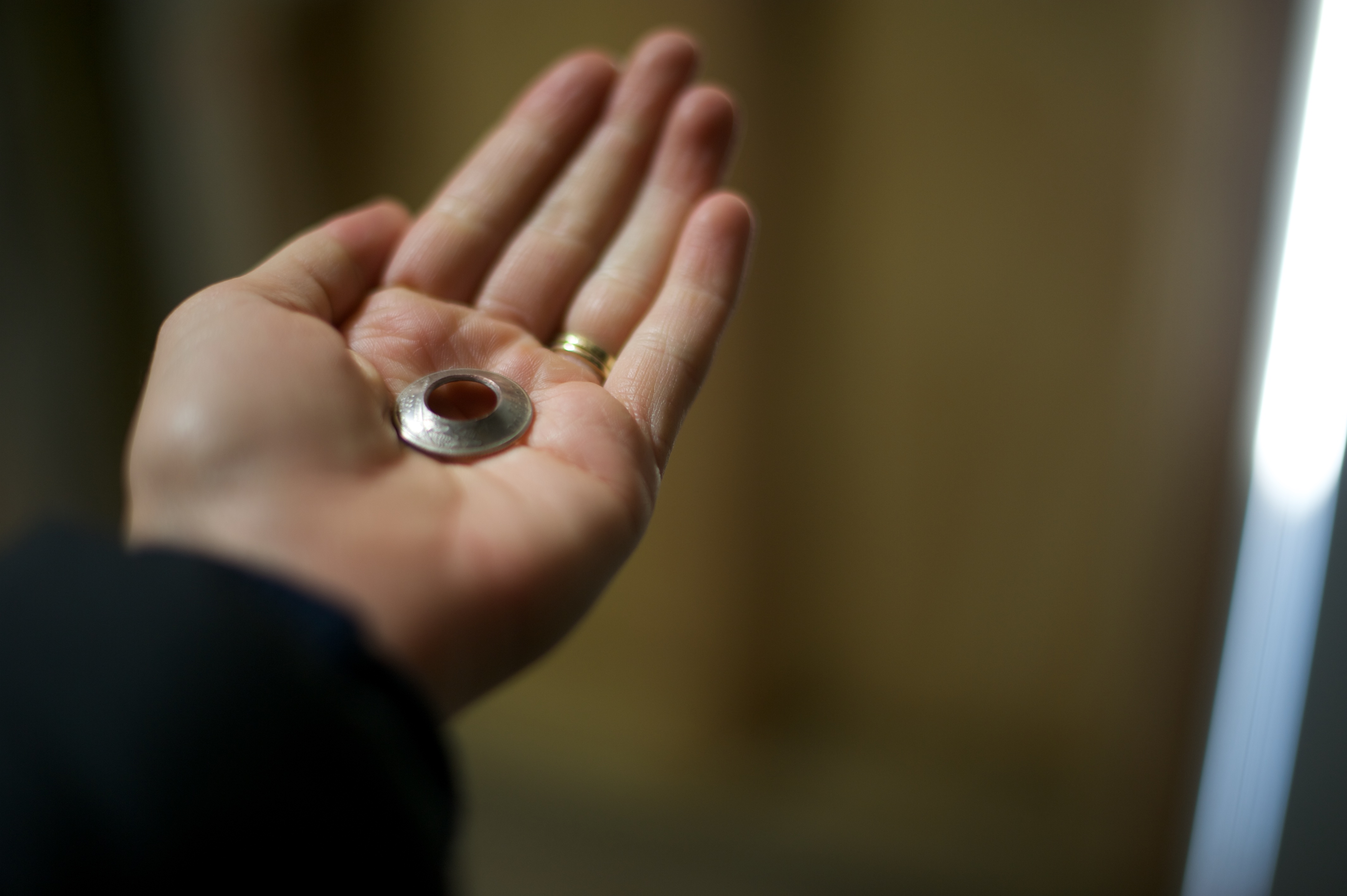 | Javier resurfaced from the workshop with a triumphant smile on his face and announced that he had succeeded making his gift on the first try, which apparently was somewhat unexpected. I guessed about a million different things that it could be (and couldn’t have been farther from the target), and in the end we decided that he could just go ahead and give it to me early. So…he took me downstairs, made me close my eyes and hold out my hand, and then he slipped something cold around my finger. I opened my eyes, and on my finger was a beautiful ring! He had ordered two 2014 half dollars (2014 for the 5-year anniversary) and made two identical rings out of them – one for me, one for him. Javier was really surprised at how well the first one came out, and of course I was surprised he could even do something like this – he’s never worked metal before. He’s amazing! | Javier volvio a aparecer en la casa con una sonrisa triunfante que anunciaba que habia tenido exito en su primer intento de hacer el regalo, lo que aparentemente era un poco inesperado. Yo trate de adivinar que era y dije un millon de cosas (pero siempre lejos de lo era), y al final decidimos que me diera el regalo anticipadamente. Asi que me llevo al subterraneo, me hizo cerrar los ojos, y me puso algo en el dedo. Abri los ojos, y en mi dedo tenia un hermoso anillo! El habia comprador 2 monedas de medio dolar del ano 2014 (el ano de nuestro 5to aniversario) e hizo 2 anillos identicos – uno para mi y uno para el. Javier estaba sorprendido de los bien que le salieron al primer intent, y claro, yo estaba sorprendida que el pudiera hacer algo como esto – el nunca habia trabajado con metal antes. El es genial! |