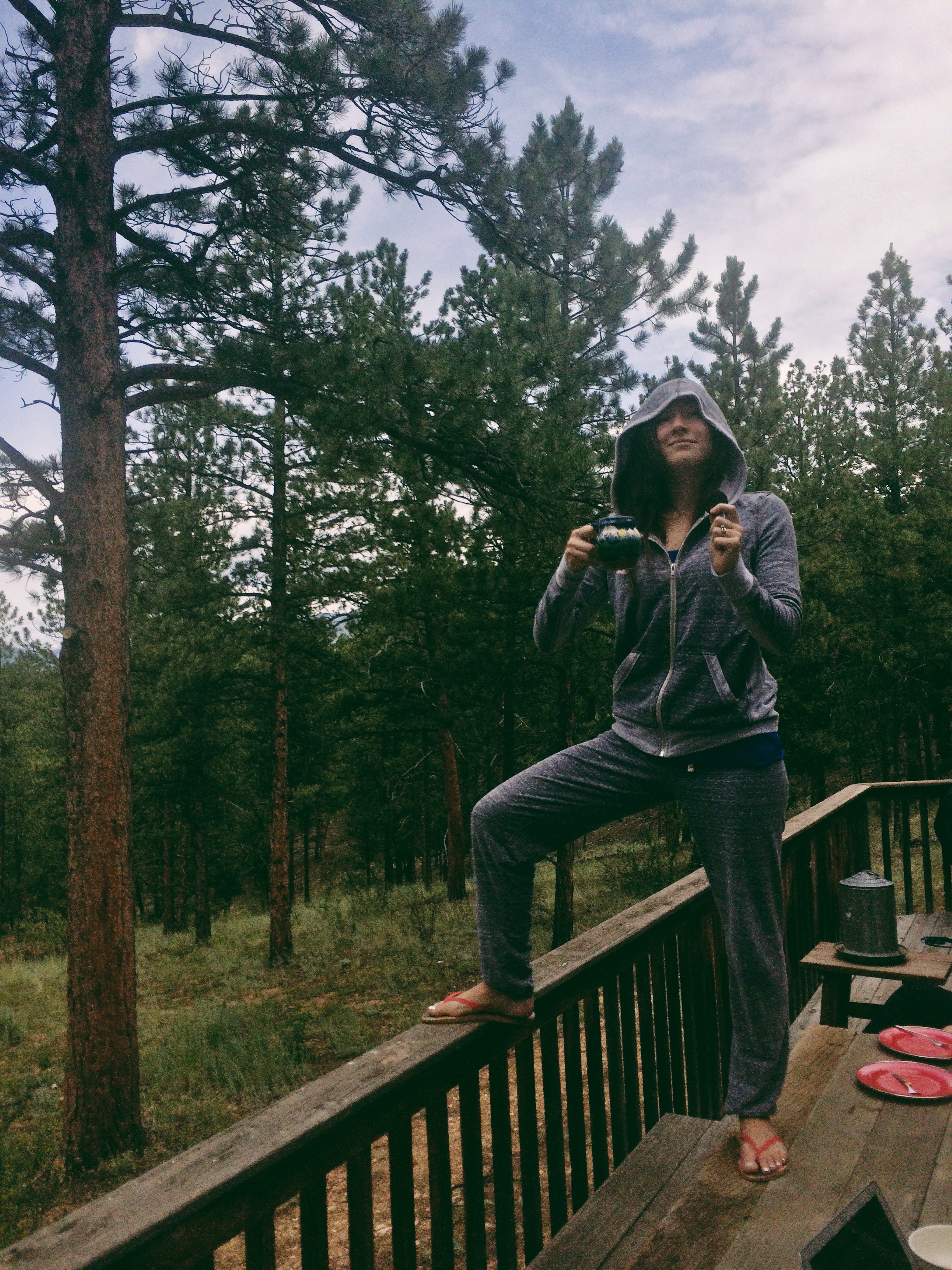 | Today is a good day. I woke up this morning and, miraculously, I could smell a pot of fresh coffee already made. I assumed I would be the first one in this group to wake up this morning, but Josh beat me to it. He fixed a pot of coffee earlier but had since gone back to bed, so lo and behold I had a whole pot waiting for me and about half an hour to enjoy it by myself in the quiet of the morning on the back deck of the Tam family cabin in Bailey, CO. I’m drinking coffee and eating oreos, so it’s definitely a day off. One glorious day in the mountains relaxing and maybe getting a hike in before coming back to grill brats and watch Interstellar or some other movie the guys got from Redbox yesterday on our way here. We slept in, which is a rare event while on tour. We have no schedule today, no need to be anywhere, and we’ll probably even get some writing time in. It’s a good day! | Hoy es un buen dia. Desperte en la manana y, milagrosamente, pude oler la tetera con cafe recien preparado. Pense que seria la primera en despertar del grupo, pero Josh me gano. El hizo el cafe temprano pero volvio a su cama, asi que ahi estaba yo con un jarro de cafe esperandome y media hora para disfrutar la tranquila manana, sola en la cabana de la familia Tam en Bailey, Colorado. Estoy tomando cafe y comiendo galletas, asi que es definitivamente un dia libre. Un glorioso dia en las montanas, donde podre relajarme, salir a caminar, tirar unas longanizas a la parrilla, y ver alguna pelicula. Dormimos hasta tarde, lo que no pasa muy seguido cuando estamos en tour. Hoy no tenemos nada en la agenda, no tenemos que ir a ninguna parte, y lo mas probable es que vamos a escribir una cancion. Es un buen dia! |