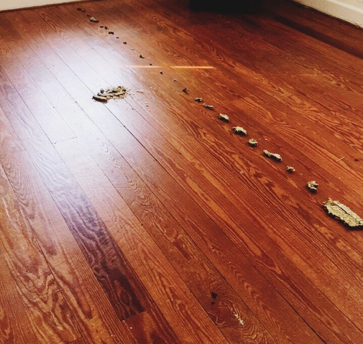 I had to run to do a photo session around the time we finished tearing up the carpet, so while I was gone Javier pulled all of the staples out. When I came back from the session, the only thing left was to clean the heck out of those floors and install quarter round. Javier mopped while I scraped off old splashes of paint from former sloppy paint jobs.