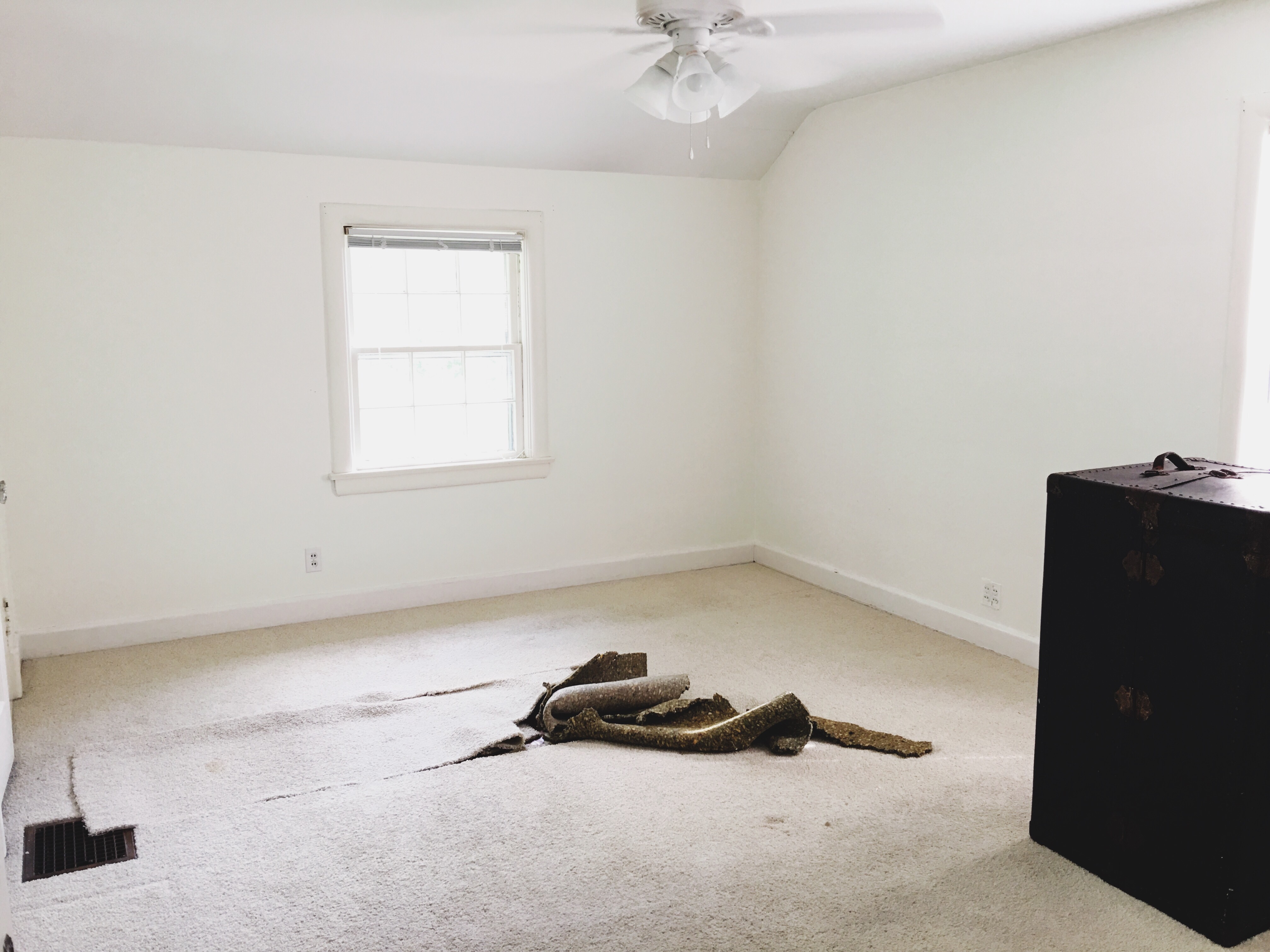 We wanted to hold off tearing up the carpet until after we painted so we could avoid dealing with drop cloths and worrying about the wood. On Friday we bought new paint (Valspar Fresh Cotton) to cover the dark forest-y green and brighten the room up a bit, and on Saturday morning we got to work! We wound up having to paint three coats to get rid of any green peeking through, and the final color is a glorious, happy off-white. I love it.