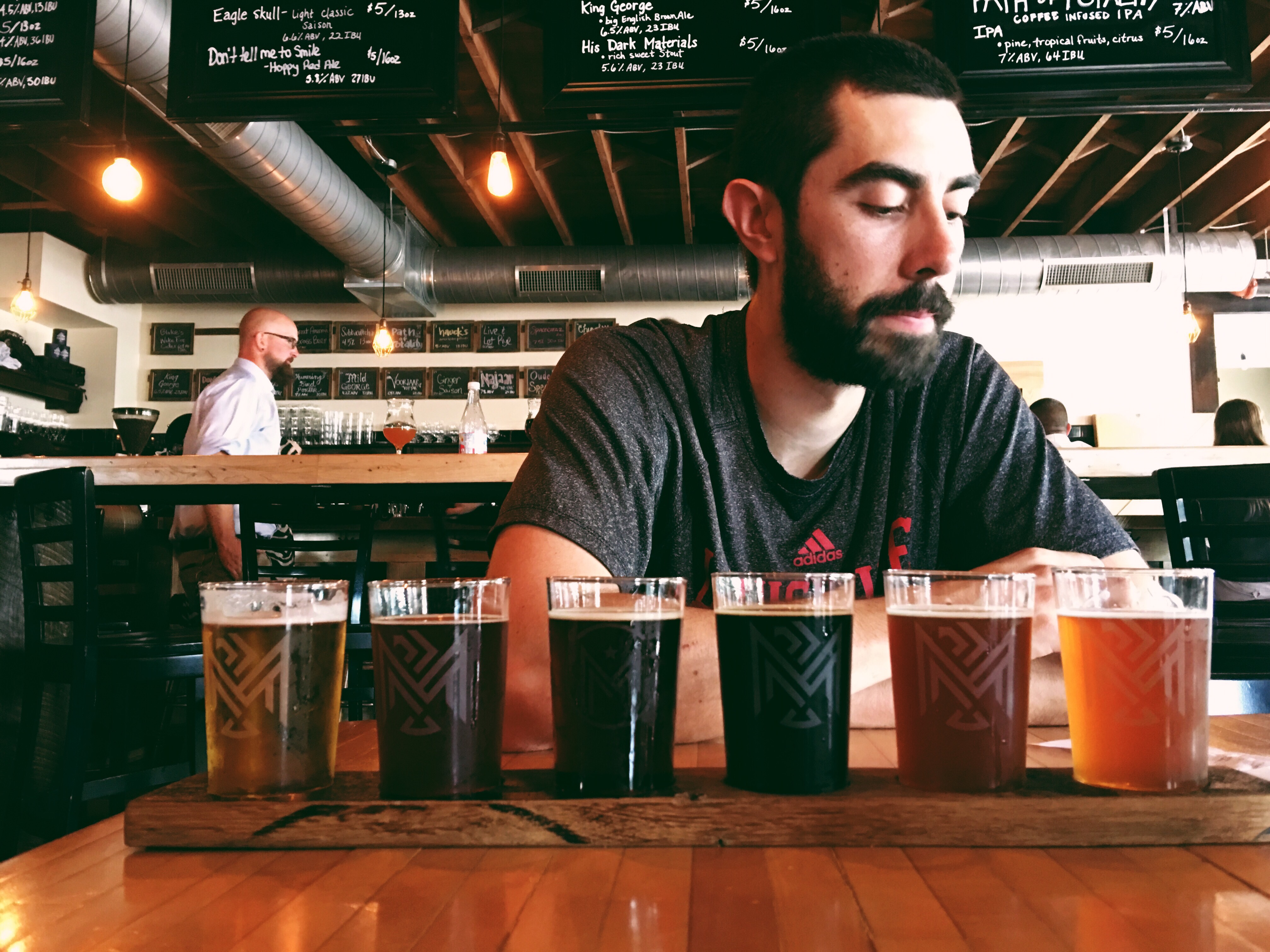 This weekend I saw two different instagram posts about Monnik Beer Company from two people who don’t know each other, so I figured it was the universe telling me that Javier and I should try it. Monnik is close to downtown in Schnitzelburg near Slugger Field where we were heading for the Louisville City FC game. It’s not easy going to a brewery in the summer while pregnant…a nice cold beer sounds SO GOOD and I just can’t enjoy a whole one for myself. But Javier ordered a flight of samples and I tried a sip of each. Javi tends to like the lighter beers, while I love the smooth porters and stouts. This brewery has a delicious selection of both that they make on site, and we highly recommend all of them! The in-house brews that we tried were excellent.