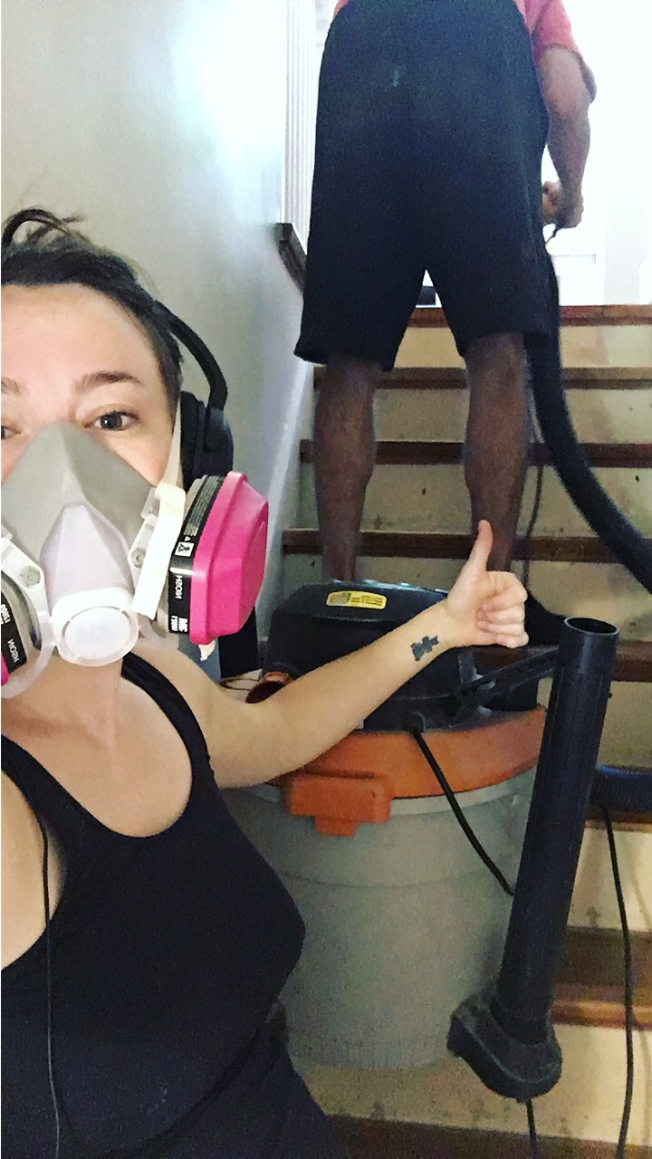 We ran through the options: buy new steps (expensive), paint these steps (meh), remove the steps, refinish them outside and re-install (labor intensive). Finally we decided to try refinishing the steps where they are: sand them down past the runner stains with our hand sander, sand in the cracks and corners by hand, stain the steps, and add a coat of polyurethane. The main problem: we still can’t open a single f*!#ing window in our house! We can’t use ANY stain or poly until we can air the house out – I can’t sleep in my respirator mask and Javi doesn’t even have one. So that part will have to wait.