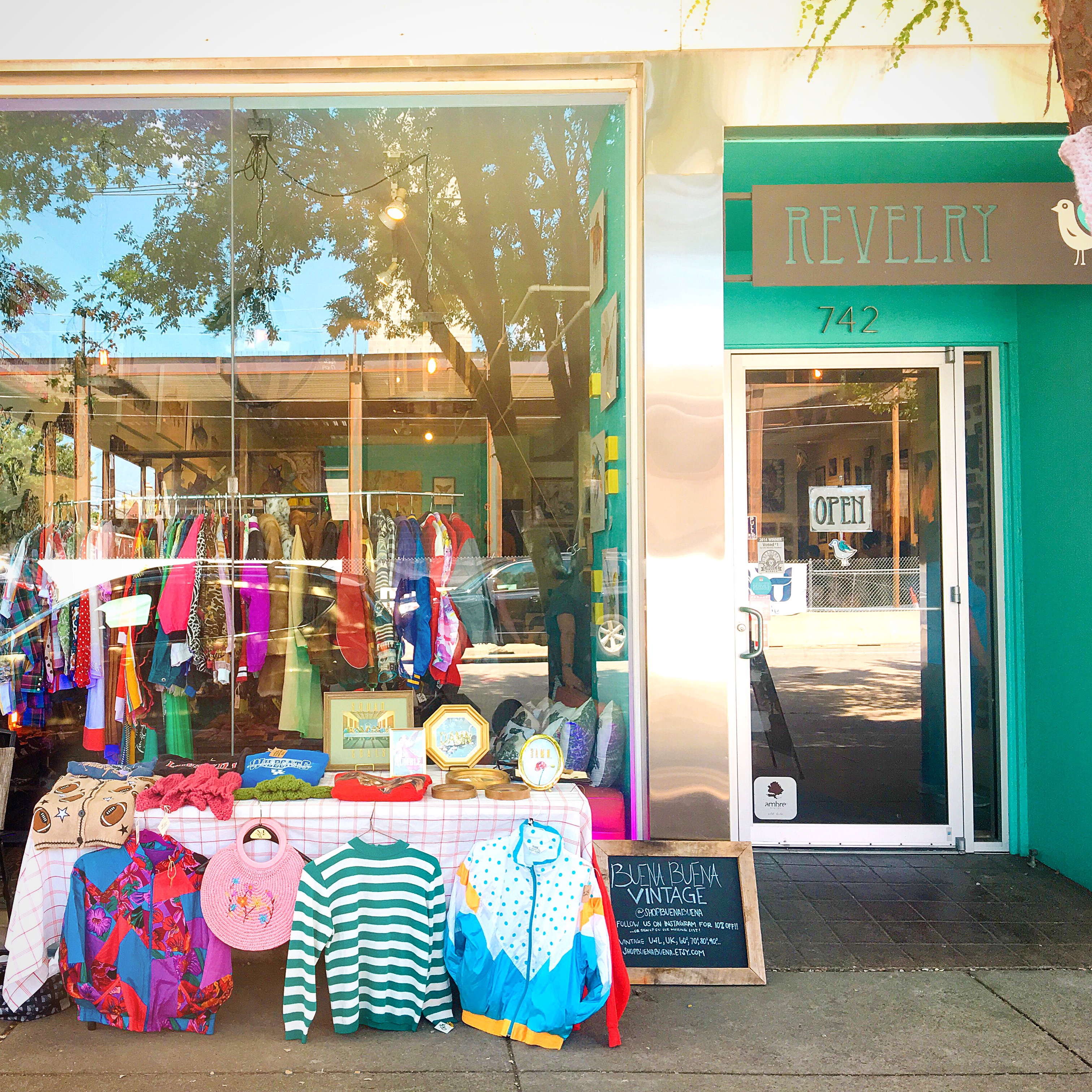 At the July market I also happened to meet Mo McKnight Howe, the owner of my favorite local gallery and boutique Revelry. Mo purchased a badass vintage Louisville bomber from my shop (the one hanging from the front of the tent in the above photos), and when I found out that she’s the woman behind Revelry I contacted her to ask if I could set up a pop up shop in front of the gallery at some point. Mo and the amazing ladies at Revelry** have since hosted two pop ups for Buena Buena, and I can’t thank them enough for giving me the space and time to bring my inventory out of online-world and into Louisville! This is another thing I’ve been wanting to do for months – connect with other local shop owners and be more involved in the local Louisville community. I love running the online shop, but I’m a social person at heart and creating listings behind the computer all day can be a bit of a drag. I absolutely love the gallery and everything they have going on in the boutique, so if you’re visiting Louisville make sure to put it on your list of must-visit stops. Everything in the boutique and gallery is made by local artists, so you’re not only supporting Revelry but also a host of local freelancers and artists around the city. GOOD PEOPLE!