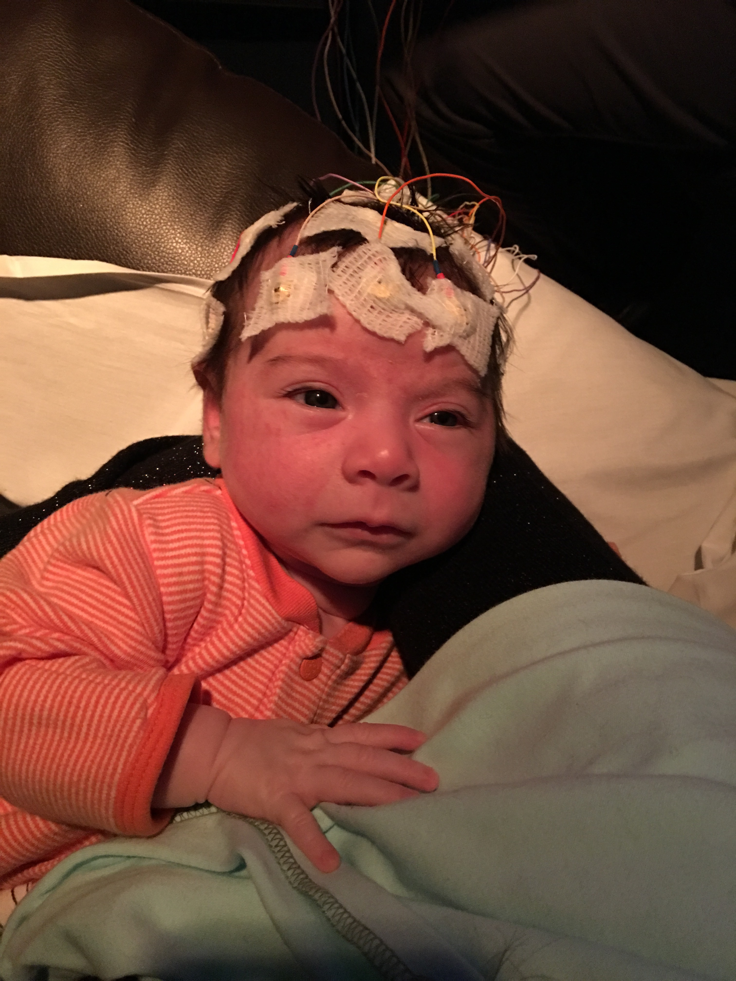 Last week was Javier’s first week back at work after a month of family leave, and my first me-and-P day began with a morning appointment at the neurologist. Penelope’s alert personality is the strongest signal that we have right now to gauge the severity of the stroke’s damage to her brain. She is smiling, responding to our voices, focusing on our faces, cooing and giving us clear signals when she is hungry, tired, or has a dirty diaper, and all of these baby milestones are signs that she is undergoing normal cognitive development for a baby her age. This is GREAT news for us, and it was a huge relief to hear her neurologist’s report confirming that she’s on the right path. While we were in the doc’s office she underwent another EEG procedure. This time she was only hooked up for 30 minutes, and I was able to hold her for the duration of the procedure. Much less traumatic than the 40+ hour EEG she underwent in the NICU! I still hate to see her with all of those wires coming off of her little head…