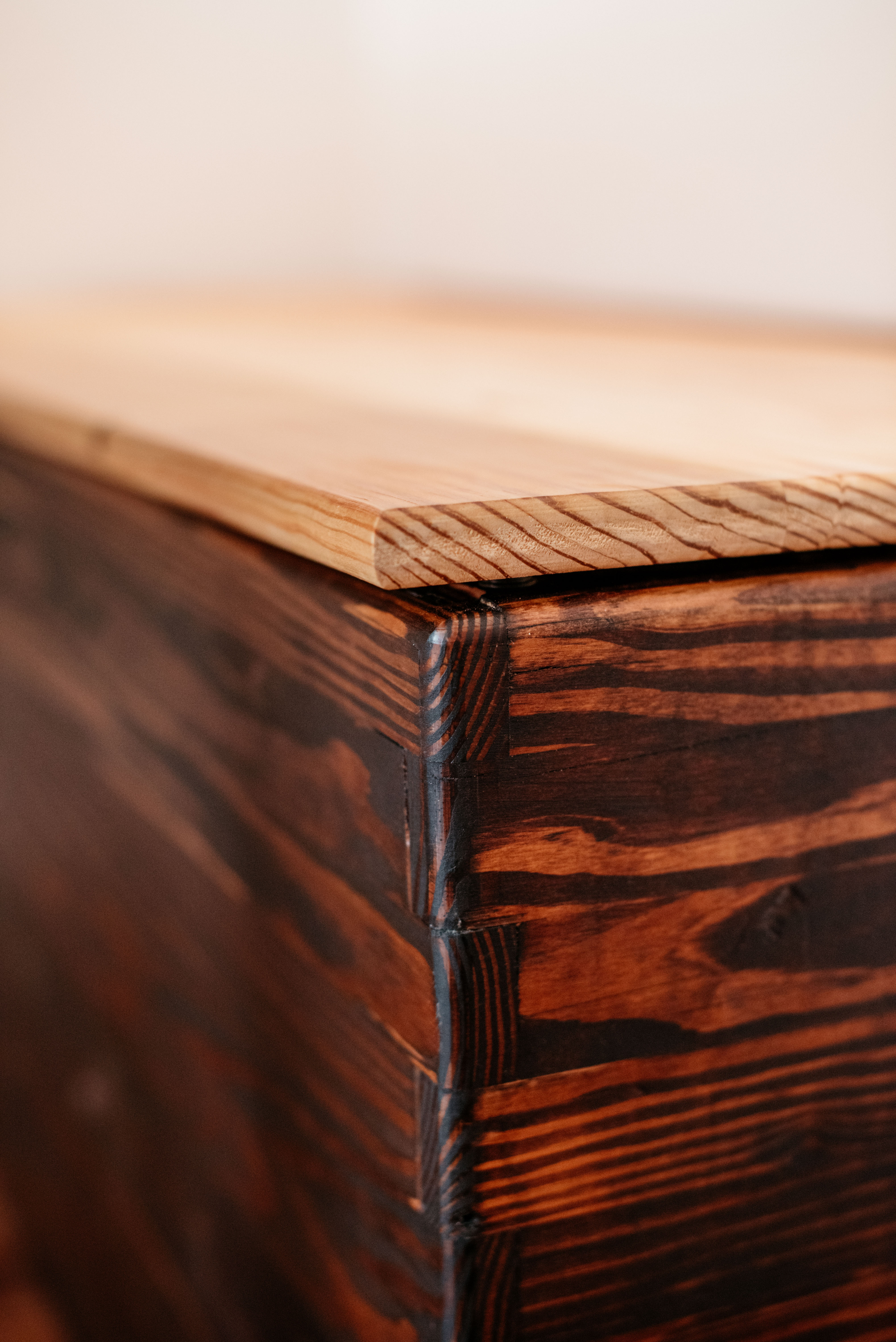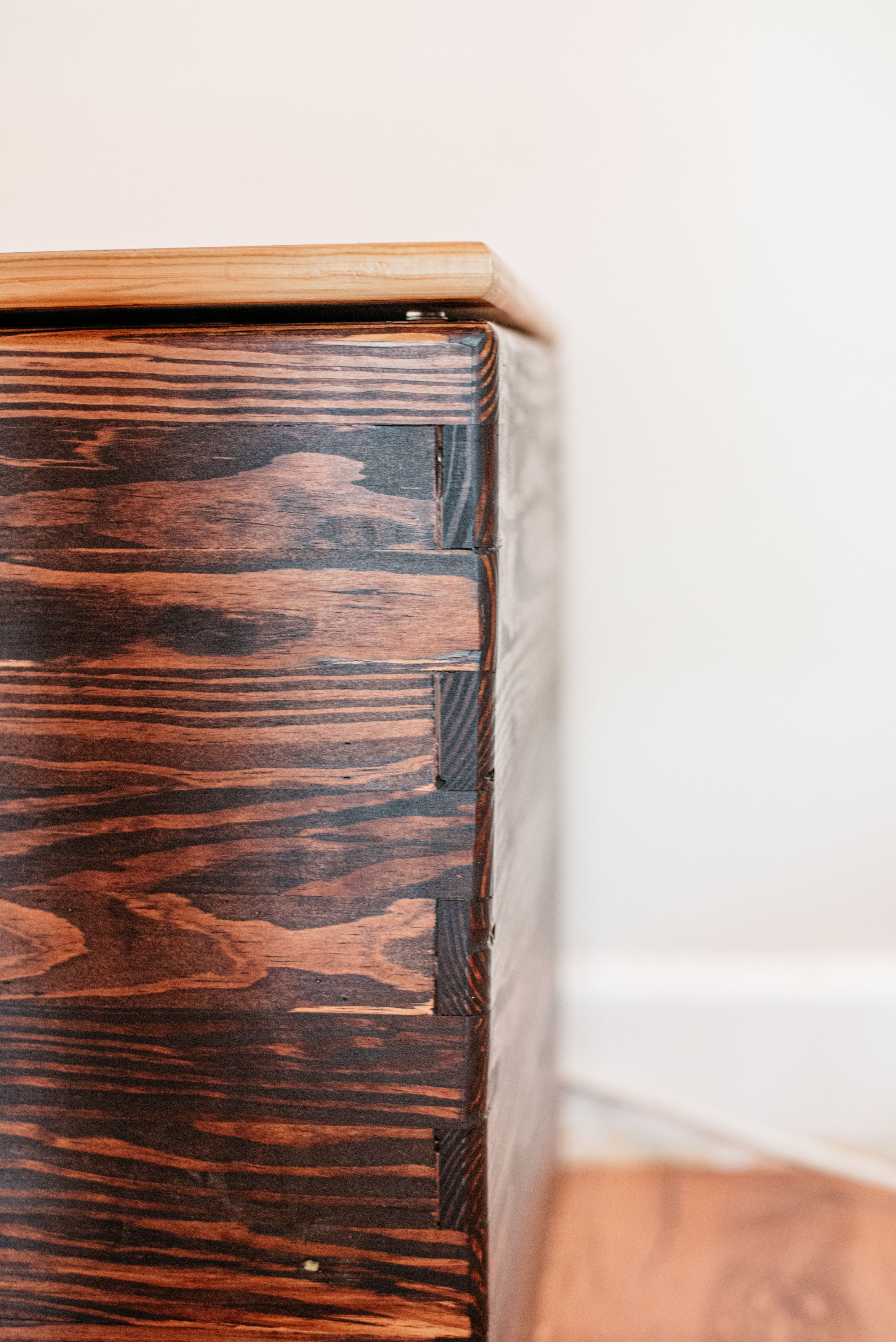 The bench is a simple box with a top that opens up using a piano hinge. The box’s body was made of 2 x 4s joined with pocket holes using my Kreg jig . The great thing about this jig is that the joints are strong and quick to make for a sturdy base. The pocket holes can be filled with ready to use plugs , though in this particular situation I didn’t do anything since they are hidden inside the bench. For the outside of the box I used the pine planks. I ripped the planks to 1 ½ in. pieces and glued them to each other and the box’s body without using any nails or screws. To create a decorative effect, the corners are interlocked with a pattern known as box joint, finger joint, or comb joint. Using the router, I rounded the edges with a rounding bit to prevent easy breakage from daily use/abuse; the sharper a corner is in any project, the weaker and more prone to breaking it will be. Once assembled, the box was sanded using a belt sander first and then an orbital sander for a smooth feel. I decided to stain the bench dark to create some contrast. I used a Minwax stain and once dried and cured I applied a coat of Odie’s Oil. The top of the bench was made of 5 planks glued together, sanded, and finished. I did not stain it. I ripped the seat on the table saw to allow installation and proper function of the piano hinge. The last detail will be to make a cushion for the bench for more comfortable seating, but not having the cushion does not stop us from being able to use the bench right away.