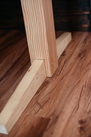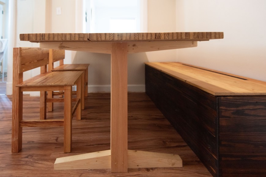 The table has only one leg – the other side of the table is bolted to the wall. The one leg was made of Douglas fir 4 x 4 and two pieces of 2 x 4 pine. The 4 x 4 is a pedestal that houses a top and bottom piece of 2 x 4 running the width of the table. The 2 x 4 pieces are tapered for nicer esthetics. To beef up each joint in the pedestal I used a couple of wood dowels that cross all pieces and glued them in place – they are not going anywhere! Once again after sanding with the belt sander using 120 grit and the orbital sander using 180, 240, and 320 grit, I finished the top with Odie’s Oil because it is food safe. The final product is amazing. The table is perfect for what we need and is already getting a ton of use. If one day it needs to be moved, I’ll have to build a second pedestal, but for now, we have no plans to move it anywhere.