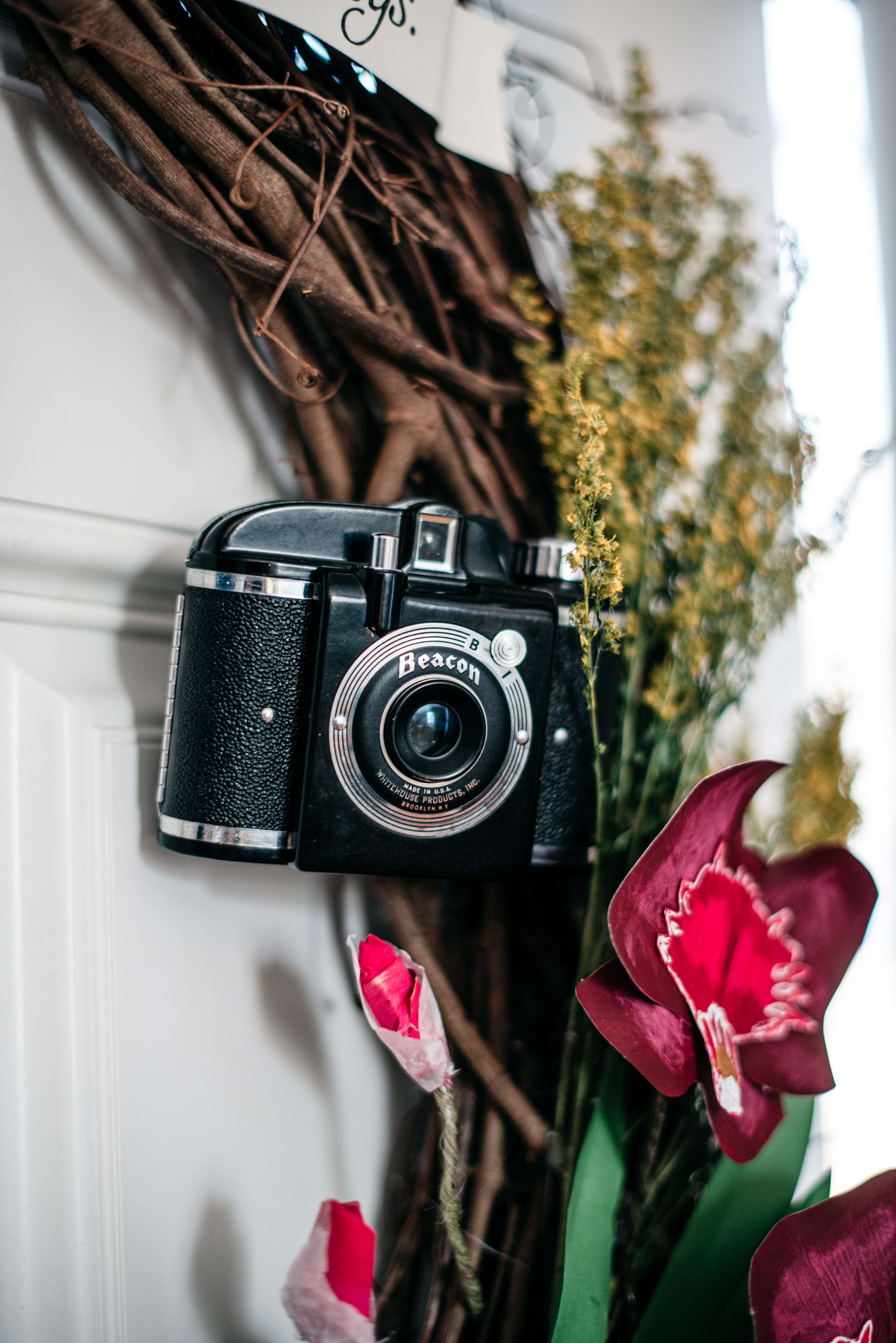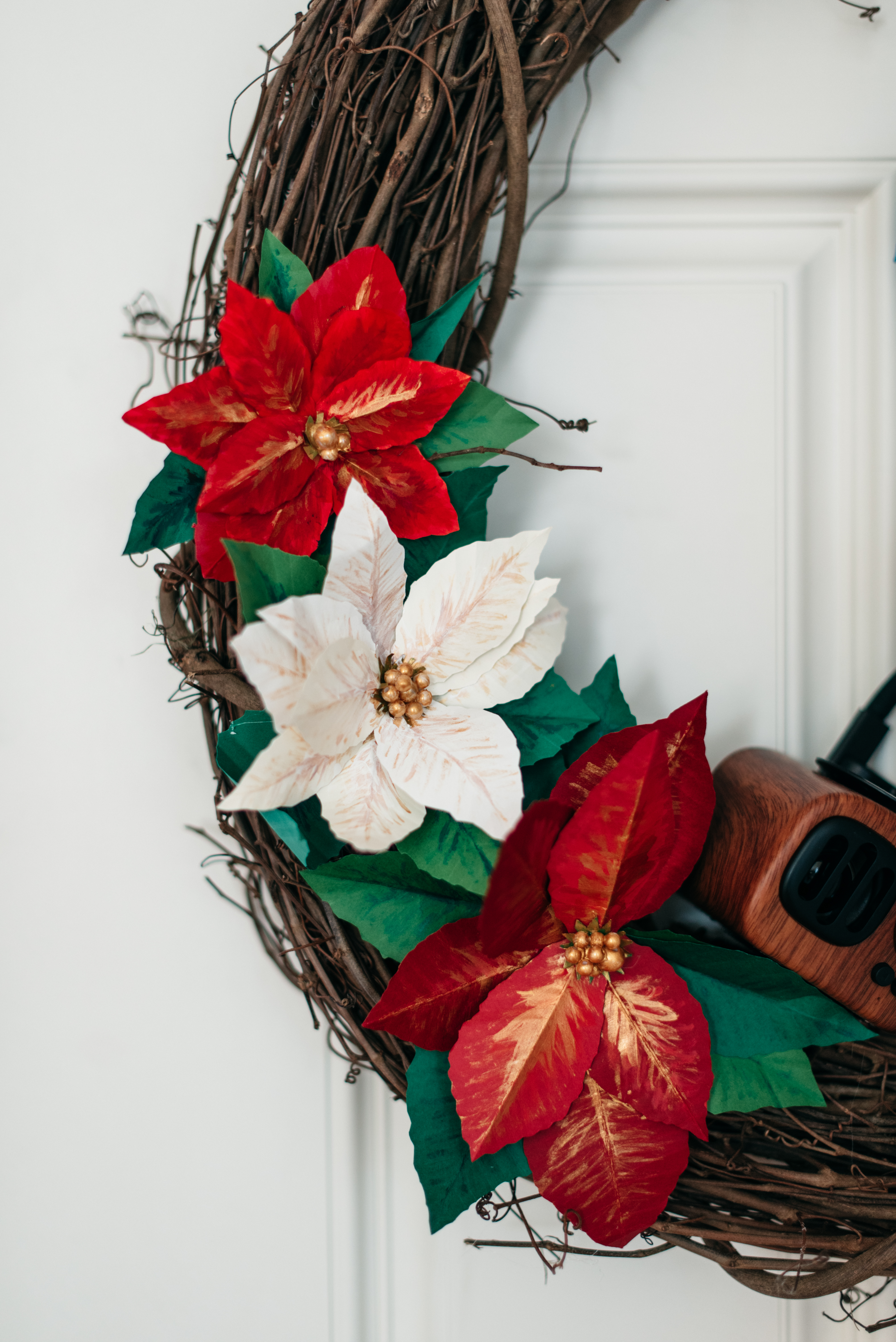 Moving on up the left side are intricate paper poinsettias – our only florals at the wedding. My bouquet was made of poinsettias, and all of the decor at the church was poinsettias (bonus to getting married at Christmas!). LOVE!