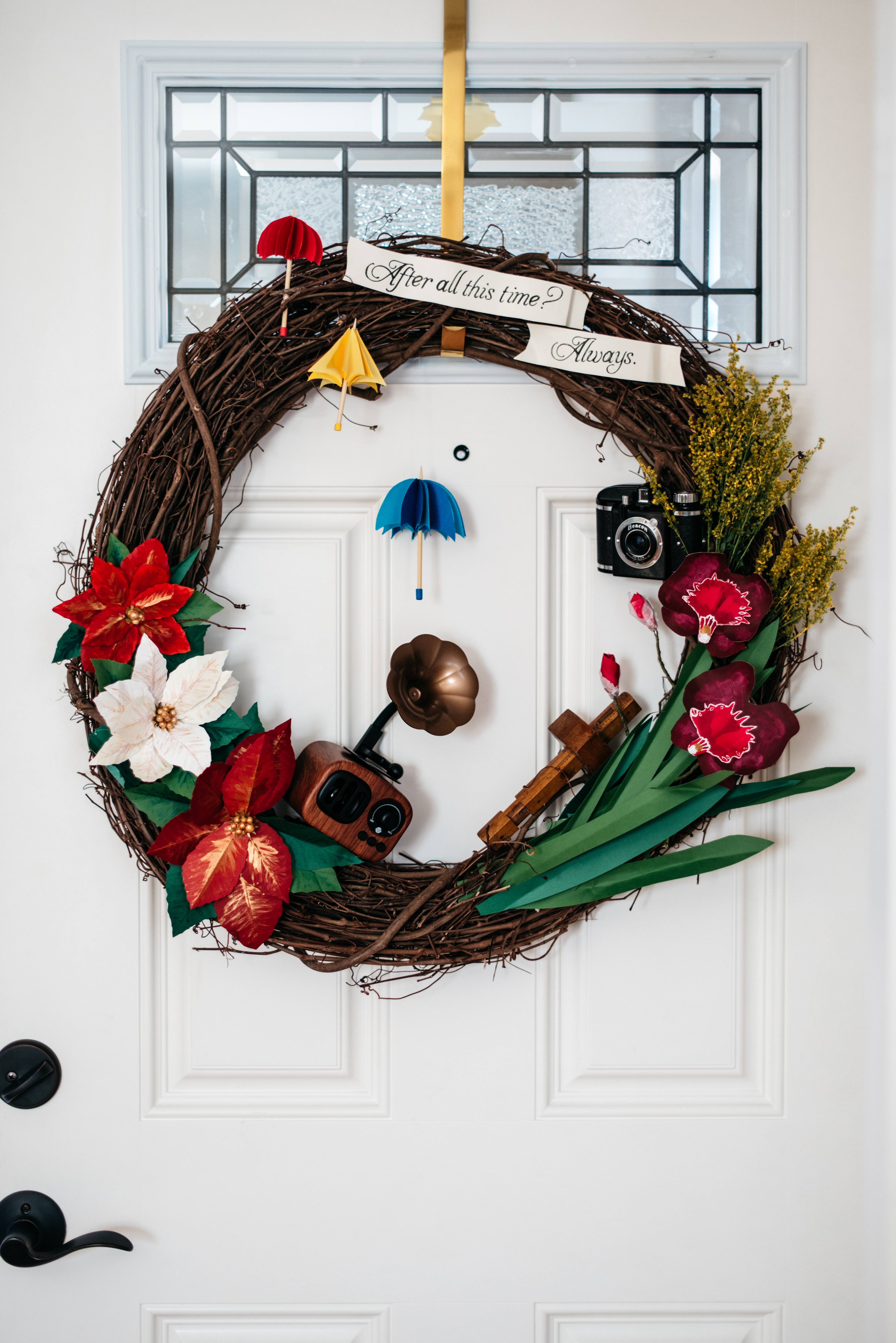 Starting at the top, the wreath has one of my favorite Harry Potter quotes – it’s from the scene in the 7th book when Dumbledore asks Snape “after all this time?” (meaning, even after Lily has been dead for 17 years you still love her?) and Snape responds “always” – it just melts my heart. Snape is such a softy deep down. ANYWAY…