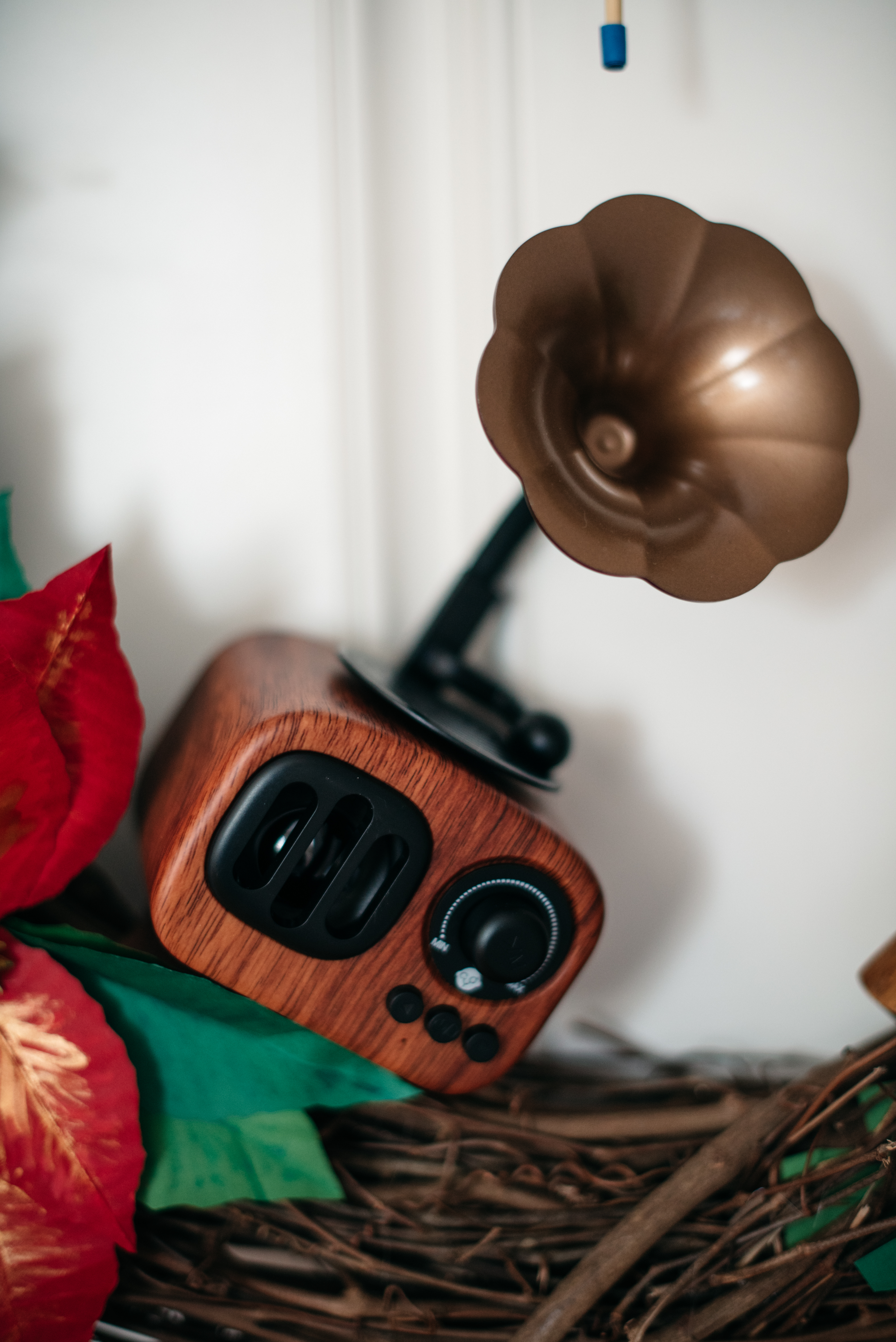 Next to the woodworking tool is a gramophone with a bluetooth speaker inside – of course music has to show up!! When Javi first showed me the wreath he had it playing “Danny’s Song” which was our first dance. And of course I was crying listening to the song and looking at all the beautiful details on the wreath. The gramophone is attached with velcro so we can take it off and charge it if we need to – brilliant!