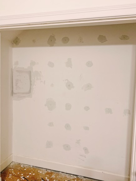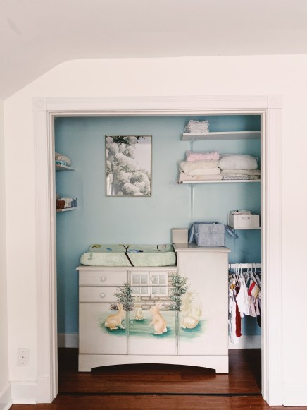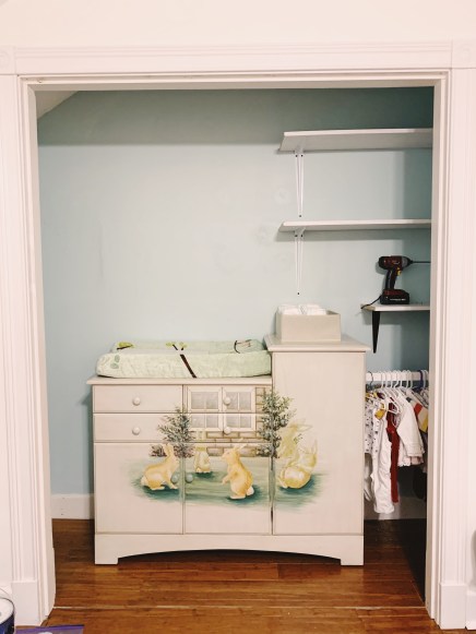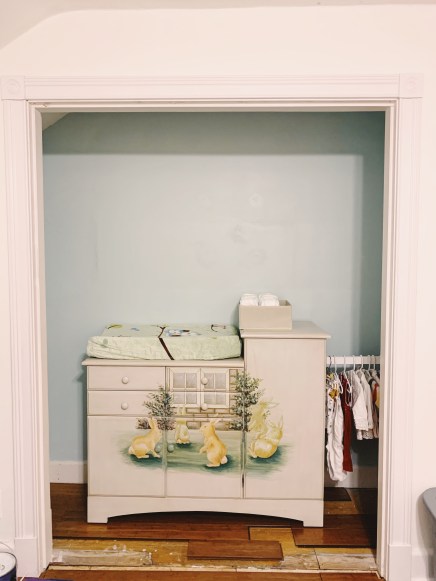 When Javi replaced the floors upstairs he didn’t replace the pine in the closets, so the floors were still the old unfinished boards that we uncovered when we first lifted up the carpet back in 2017. So the steps we needed to take were to clean out the closet, remove the shelving, spackle / dry wall the holes in the wall, paint, replace the floors, add new shelves, and find a dresser / changing table that would fit the space. Quite a bit of work to finish in a short time!