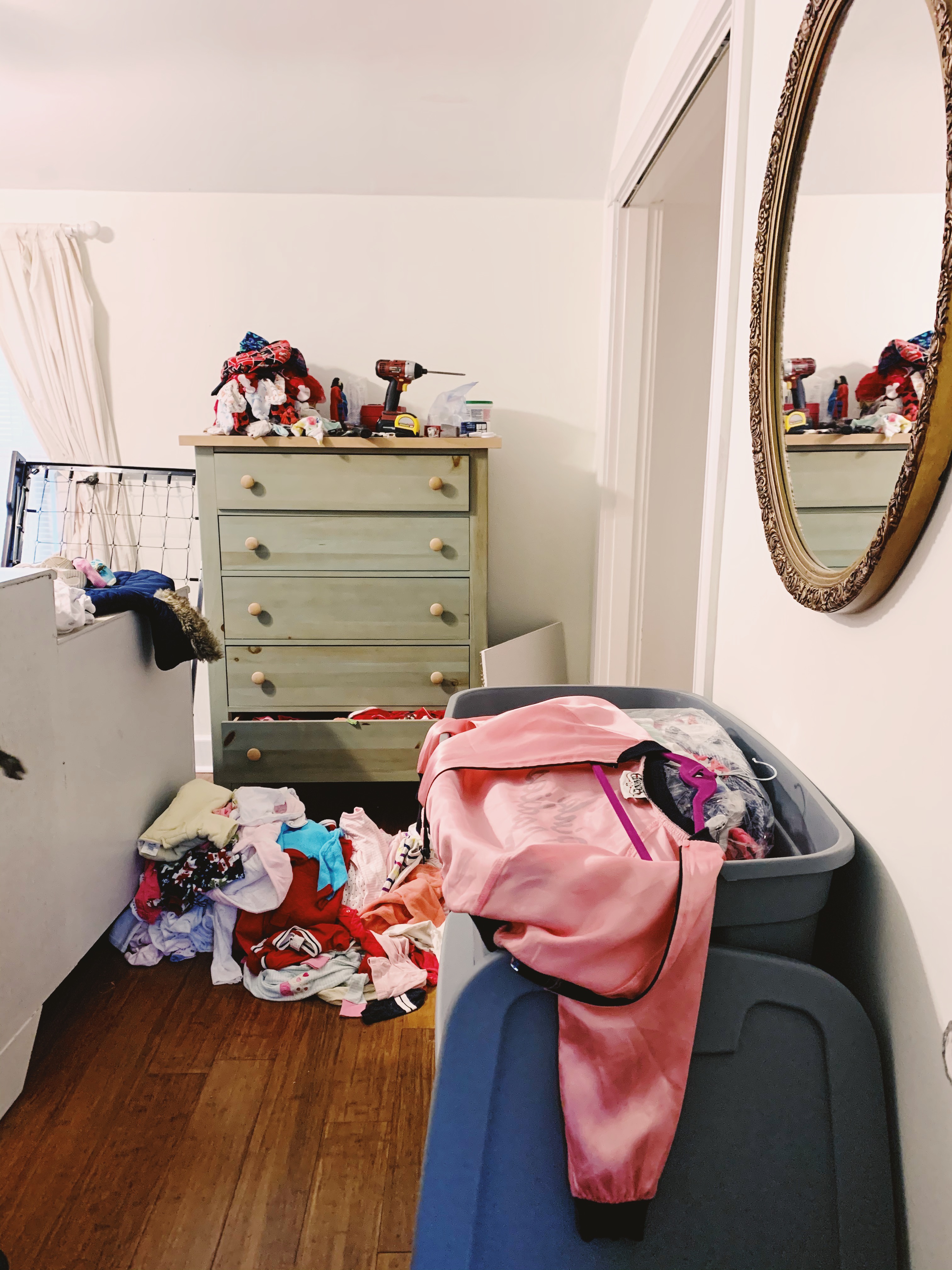Our house is a 3BR 2 bathroom, and for months we’ve been throwing around the endless possibilities of how to set Goldie up with a bedroom and maintain the ability to host guests. When Penny was born we gave her the smallest bedroom with the plan to move her to the bigger room when another kid arrived, but knowing her personality and how much change she’s already facing with her baby sister, we figured it’d be way, way too much change to put her in a brand new room just days before Goldie’s arrival. Penny loves her room and her crib, so she’ll stay there for awhile.
