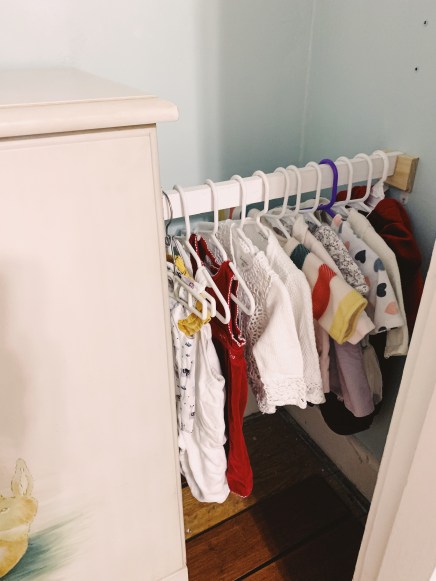 Javi then laid down the floors with leftover planks we have stored in the basement, and put the dresser into place. He added shelves that we actually salvaged from a white bookshelf we aren’t using anymore, and painted the braces the same color as the wall so they blend nicely. I was finally able to fold and organize all of Goldie’s clothing into her drawers, which was really starting to stress me out! I realized that even with all the storage we had with the drawers and shelves, I didn’t have anywhere to hang the few dresses and jackets I have for Goldie. Javi added a little bar of wood that stretches from the dresser to the side of the closet, which is exactly enough space I need for now for hanging her clothes. I’m assuming we’ll eventually need more hanging space but for now this is definitely enough.
